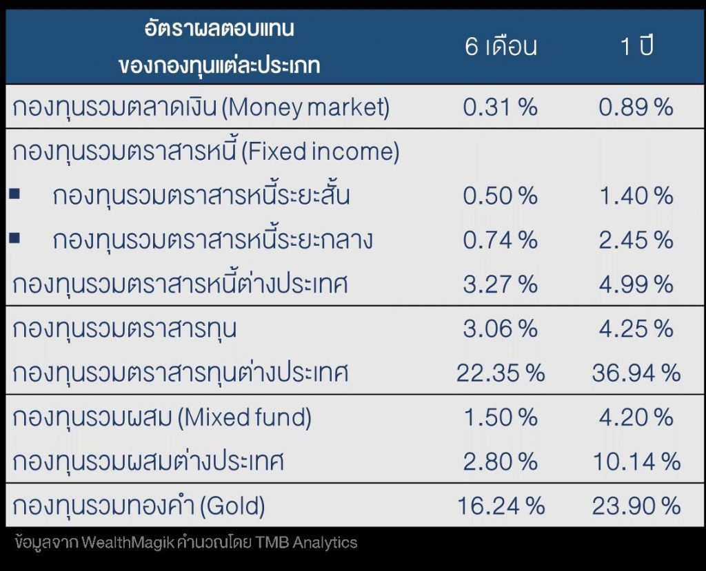 หากผู้ออมต้องการผลตอบแทนสูงกว่าเงินฝาก และสามารถรับความเสี่ยงเพิ่มขึ้นได้ รวมทั้งเป็นนักลงทุนรายย่อยไม่สามารถลงทุนได้เองหรือขาดความเชี่ยวชาญและประสบการณ์ ผู้ออมอาจเลือกลงทุนในกองทุนรวมที่มีนโยบายการลงทุนหลากหลายประเภท ซึ่งสัดส่วนการถือครองของนักลงทุนเมื่อพิจารณาจากมูลค่าทรัพย์สิน ณ มิถุนายน 2563 หลักๆ เป็นกองทุนรวมตราสารหนี้ 39% กองทุนรวมตราสารทุนอยู่ที่ 29% และกองทุนรวมตลาดเงิน 20% เมื่อพิจารณาอัตราผลตอบแทนกองทุนรวมในระยะ 6 เดือนและ 1 ปีที่ผ่านมา พบว่ากองทุนรวมตลาดเงินให้อัตราผลตอบแทนที่ 0.31-0.94% เช่นเดียวกับกองทุนรวมตราสารหนี้ระยะสั้นและระยะกลางมีอัตราผลตอบแทนย้อนหลัง 6 เดือนอยู่ที่ 0.5-0.74% ซึ่งต่ำกว่าอัตราดอกเบี้ยออมทรัพย์พิเศษที่ 1.3% ทั้งนี้ สำหรับกองทุนรวมที่ให้อัตราผลตอบแทนอยู่ในระดับสูงกว่าเงินฝากออมทรัพย์พิเศษ การพิจารณาลงทุนในสถานการณ์ที่ยังมีความเสี่ยงจากทิศทางการฟื้นตัวที่เปราะบางของทั้งเศรษฐกิจโลกและเศรษฐกิจไทย ถือเป็นโจทย์ท้าทายสำหรับผู้ลงทุนอย่างมาก รวมทั้ง การลงทุนในตลาดสินค้าโภคภัณฑ์อย่างทองคำ แม้ว่ามีแนวโน้มที่จะให้อัตราผลตอบแทนสูงต่อเนื่องในฐานะที่เป็นเครื่องมือการลงทุนที่มีความปลอดภัยสูง (Safe-Haven) ในสายตานักลงทุน แต่ก็มีความผันผวนสูง