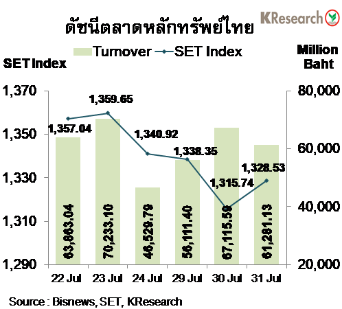 กรุงเทพฯ 1 ส.ค.-เงินบาท แข็งค่า หุ้นไทยร่วงลงตามแรงขายของนักลงทุนสถาบันและต่างชาติ “กสิกรไทย” คาดสัปดาห์หน้า กรอบเงินบาท 30.90-31.40 บาทต่อดอลลาร์ฯ ดัชนีหุ้นไทยมีแนวรับที่ 1,315 และ 1,300 จุด ขณะที่แนวต้านอยู่ที่ 1,350 และ 1,365 จุด