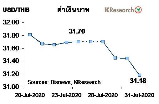 บริษัท ศูนย์วิจัยกสิกรไทย จำกัด รายงานว่า สัปดาห์ที่ผ่านมา เงินบาทแตะระดับแข็งค่าสุดในรอบ 3 สัปดาห์ที่ 31.18 บาทต่อดอลลาร์ฯ ในช่วงปลายสัปดาห์ โดยการแข็งค่าของเงินบาทเป็นไปตามภาพรวมของสกุลเงินอื่นๆ ในภูมิภาค ขณะที่เงินดอลลาร์ฯ เผชิญแรงขายหลังธนาคารกลางสหรัฐฯ (เฟด) ส่งสัญญาณผ่อนคลายทางการเงินด้วยทุกเครื่องมืออย่างเต็มรูปแบบอย่างไม่จำกัดเพื่อหนุนเศรษฐกิจสหรัฐฯ กลับสู่เส้นทางการฟื้นตัว ทั้งนี้เงินบาทขยับแข็งค่าผ่านแนว 31.20 แตะระดับแข็งค่าสุดในรอบ 3 สัปดาห์ที่ 31.18 บาทต่อดอลลาร์ฯ ในช่วงปลายสัปดาห์ ขณะที่เงินดอลลาร์ฯ มีปัจจัยลบจากข้อมูลจีดีพีไตรมาส 2/63 ของสหรัฐฯ ซึ่งหดตัวลงลึกสุดในรอบกว่า 70 ปี และในวันศุกร์ (31 ก.ค.) เงินบาทอยู่ที่ระดับ 31.18 เทียบกับระดับ 31.70 บาทต่อดอลลาร์ฯ ในวันศุกร์ก่อนหน้า (24 ก.ค.)