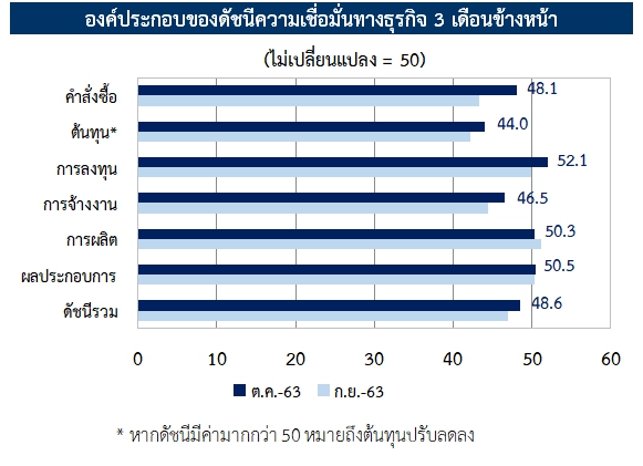ส่วนอีก 3 เดือนข้างหน้า ดัชนีฯ เพิ่มขึ้นจากเดือนก่อนมาอยู่ที่ 48.6 ซึ่งปรับดีขึ้นเกือบทุกภาคธุรกิจ โดยเฉพาะความเชื่อมั่นของกลุ่มผลิตยานยนต์ที่ดีขึ้นต่อเนื่อง สะท้อนจากดัชนีฯ อยู่เหนือระดับ 50 เป็นเดือนที่ 2 ส่วนหนึ่งเป็นผลดีจากการจัดงาน Motor show ที่จะช่วยกระตุ้นคำสั่งซื้อระยะข้างหน้าได้บ้าง เช่นเดียวกับกลุ่มโรงแรมและร้านอาหาร รวมถึงกลุ่มขนส่ง ที่ดัชนีฯ ปรับดีขึ้นมากจากทุกองค์ประกอบ เป็นผลจากนโยบายกระตุ้นการท่องเที่ยวภายในประเทศของภาครัฐ อย่างไรก็ตาม ดัชนีฯ ของกลุ่มโรงแรมและร้านอาหารยังต่ำกว่า 50 สะท้อนว่าผู้ประกอบการส่วนใหญ่ยังคงคาดว่าภาวะธุรกิจจะไม่ดีนักจากปัจจุบัน ส่วนหนึ่งอาจเป็นเพราะรายได้จากการท่องเที่ยวภายในประเทศไม่สามารถชดเชยรายได้จากนักท่องเที่ยวต่างชาติได้.-สำนักข่าวไทย