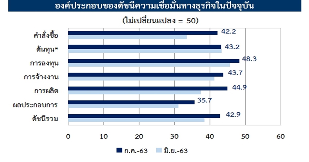 ธนาคารแห่งประเทศไทย (ธปท.) เปิดเผยดัชนีความเชื่อมั่นทางธุรกิจเดือนกรกฎาคม 2563 ดัชนีฯ ปรับเพิ่มขึ้นต่อเนื่องเป็นเดือนที่ 3 มาอยู่ที่ 42.9 ซึ่งเป็นการเพิ่มขึ้นในเกือบทุกธุรกิจ ยกเว้นกลุ่มผลิตเครื่องใช้ไฟฟ้าที่ดัชนีฯ ลดลง หลังจากปรับดีขึ้นมากเดือนก่อน โดยดัชนีฯ ของภาคการผลิตปรับเพิ่มขึ้นจากกลุ่มผลิตเครื่องจักรและอุปกรณ์และกลุ่มผลิตยานยนต์เป็นสำคัญ คาดว่าส่วนหนึ่งได้รับอานิสงส์จากการเปิดตัวรถยนต์รุ่นใหม่ในงาน Motor show ขณะที่ดัชนีฯ ของภาคที่มิใช่การผลิตปรับดีขึ้น นำโดยกลุ่มขนส่งและภาคก่อสร้างที่มีความเชื่อมั่นดีขึ้นในทุกองค์ประกอบ อย่างไรก็ตาม ดัชนีรวมและดัชนีย่อยยังคงต่ำกว่า 50 ในทุกภาคธุรกิจ สะท้อนว่าแม้ความเชื่อมั่นมีสัญญาณปรับดีขึ้น แต่ยังอยู่ในระดับต่ำโดยผู้ประกอบการส่วนใหญ่ยังกังวลต่อภาวะธุรกิจที่เปราะบาง จากทั้งกำลังซื้อที่ซบเซาและความเสี่ยงของการระบาดระลอกสองที่สูงขึ้น