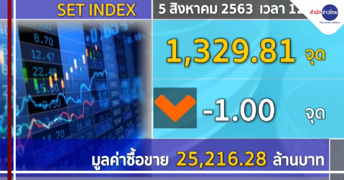 กรุงเทพฯ 5 ส.ค.- หุ้นไทยภาคเช้าวันนี้ บวกตามตลาดทั่วโลก หลังดอลลาร์สหรัฐอ่อนค่า แต่ช่วงเที่ยงกลับมาลดลงเล็กน้อย 1.00 จุด อยู่ที่ 1,329.81 จุด มูลค่าการซื้อขาย 25,216.28 ล้านบาท ขณะที่ราคาทองคำพุ่งแรงเพิ่มขึ้นบาทละ 400 บาท
