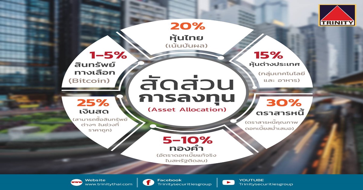 โดยทรีนีตี้ ได้แนะนำให้นักลงทุนแบ่งสัดส่วนการลงทุนดังนี้ คือ 1.ลงทุนในตลาดหุ้นไทย สัดส่วน 20% เพราะตลาดหุ้นไทยมีความโดดเด่นเรื่องผลตอบแทนจากเงินปันผล 2.ลงทุนในตลาดหุ้นต่างประเทศ สัดส่วน 15% โดยเน้นน้ำหนักลงทุนในหุ้นกลุ่มเทคโนโลยีและอาหาร 3.ลงทุนในตราสารหนี้ที่มีคุณภาพ สัดส่วน 30% เพื่อที่จะรับกระแสเงินสดจากดอกเบี้ยสม่ำเสมอ 4.ลงทุนในทองคำ สัดส่วน 5-10% เนื่องจากอัตราดอกเบี้ยที่แท้จริงในสหรัฐที่ติดลบจะส่งผลดีต่อราคาทองคำ 5.ถือเงินสด 25% เพื่อรอจังหวะซื้อสินทรัพย์ในช่วงที่มีราคาถูก และ 6. ลงทุนในสินทรัพย์ทางเลือก (Alternative Investment) เช่น Bitcoin หรืออื่น ๆ ในสัดส่วน 1-5%