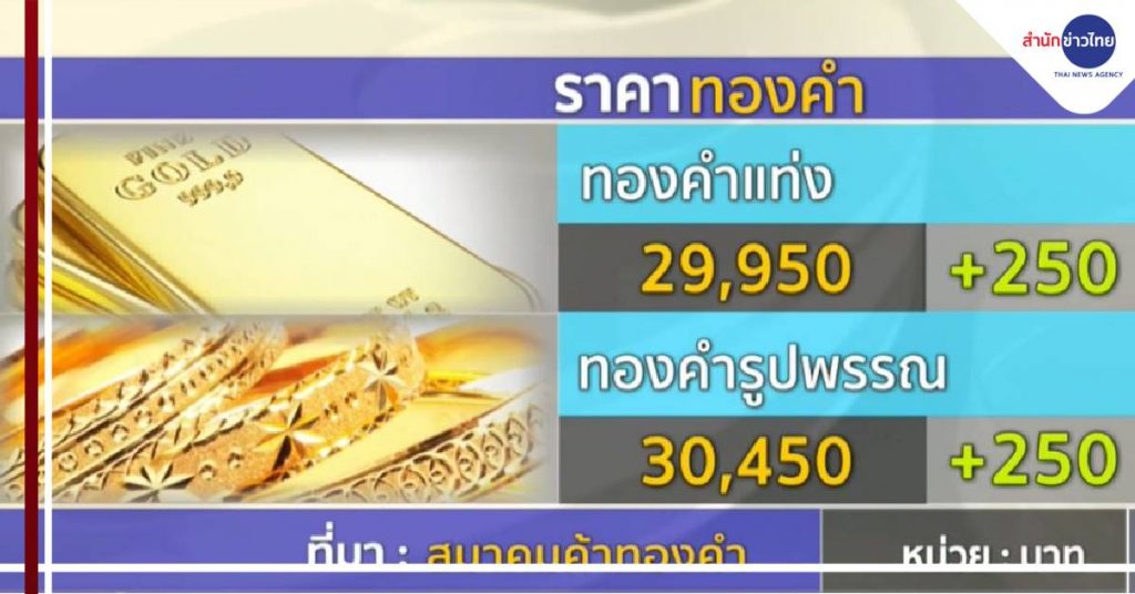 ราคาทองคำยังเดินหน้าทำสถิติสูงสุดเป็นประวัติการณ์ ขึ้นต่อเนื่องอีกบาทละ 250 บาท ราคาขายออกทองคำแท่งใกล้ทะลุ 30,000 บาท โดยช่วงเที่ยงอยู่ที่บาทละ 29,950 บาท ส่วนราคาทองรูปพรรณขายออกบาทละ 30,450 บาท หลังทองคำโลกพุ่ง 2,000 ดอลลาร์ฯ/ออนซ์ ซึ่งนายกสมาคมค้าทองคำ ชี้ราคามีโอกาสขึ้นต่อ เหตุแรงซื้อกองทุนทองคำรายใหญ่ของโลกเข้ามาต่อเนื่อง