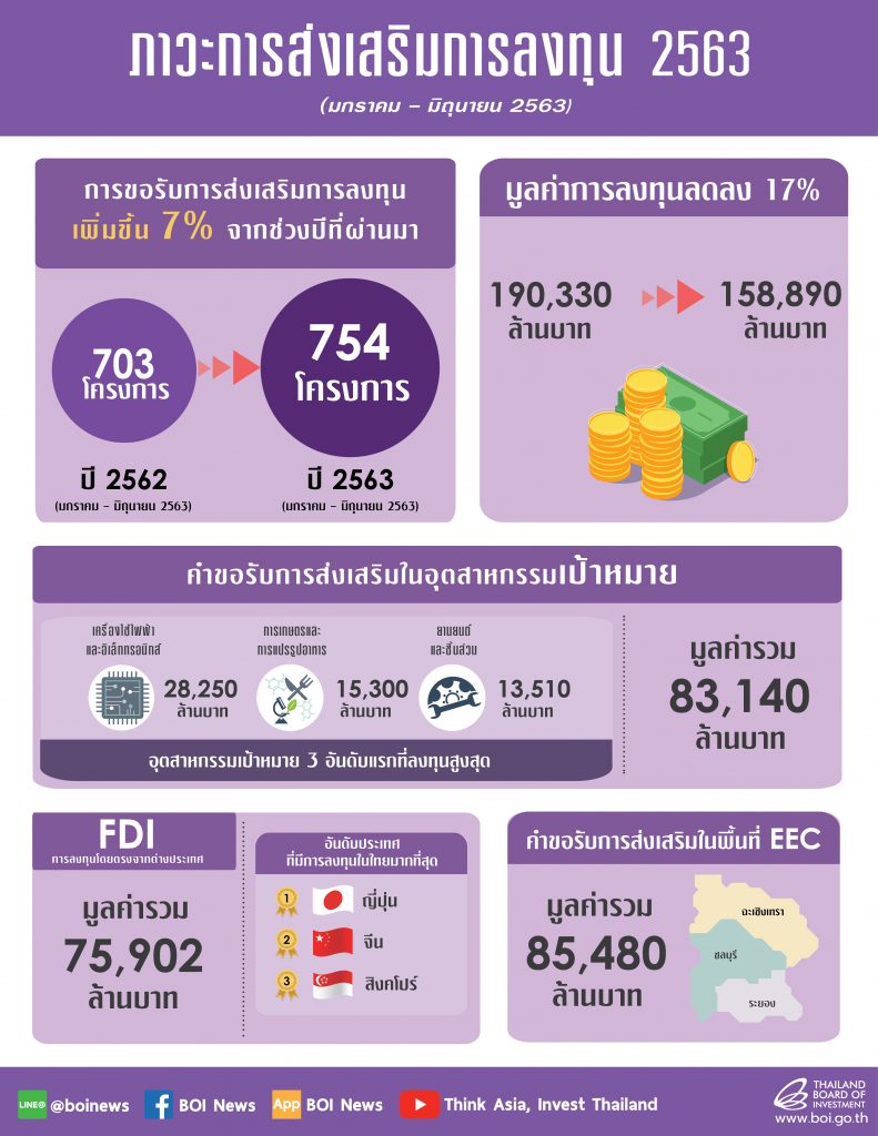นางสาวดวงใจ อัศวจินตจิตร์ เลขาธิการคณะกรรมการส่งเสริมการลงทุน (บีโอไอ) เปิดเผยว่า ในช่วง 6 เดือนของปี 2563 (ม.ค.-มิ.ย.) มีนักลงทุนยื่นโครงการขอรับการส่งเสริมการลงทุนรวมทั้งสิ้น 754 โครงการ เพิ่มขึ้นร้อยละ 7 เมื่อเทียบกับช่วงเดียวกันของปีก่อนที่มีจำนวน 703 โครงการ ขณะที่มีมูลค่าเงินลงทุนรวม 158,890 ล้านบาท ลดลงจากช่วงเดียวกันของปีก่อนร้อยละ 17 ซึ่งมีมูลค่ารวม 190,330 ล้านบาท เนื่องจากโควิด-19 และช่วงเดียวกันของปี 2562 มีโครงการขนาดใหญ่ด้านพลังงานไฟฟ้าจากเชื้อเพลิงชีวมวลยื่นขอรับการส่งเสริม แต่มีแนวโน้มดีขึ้นเมื่อเทียบกับช่วงไตรมาสแรกของปีนี้