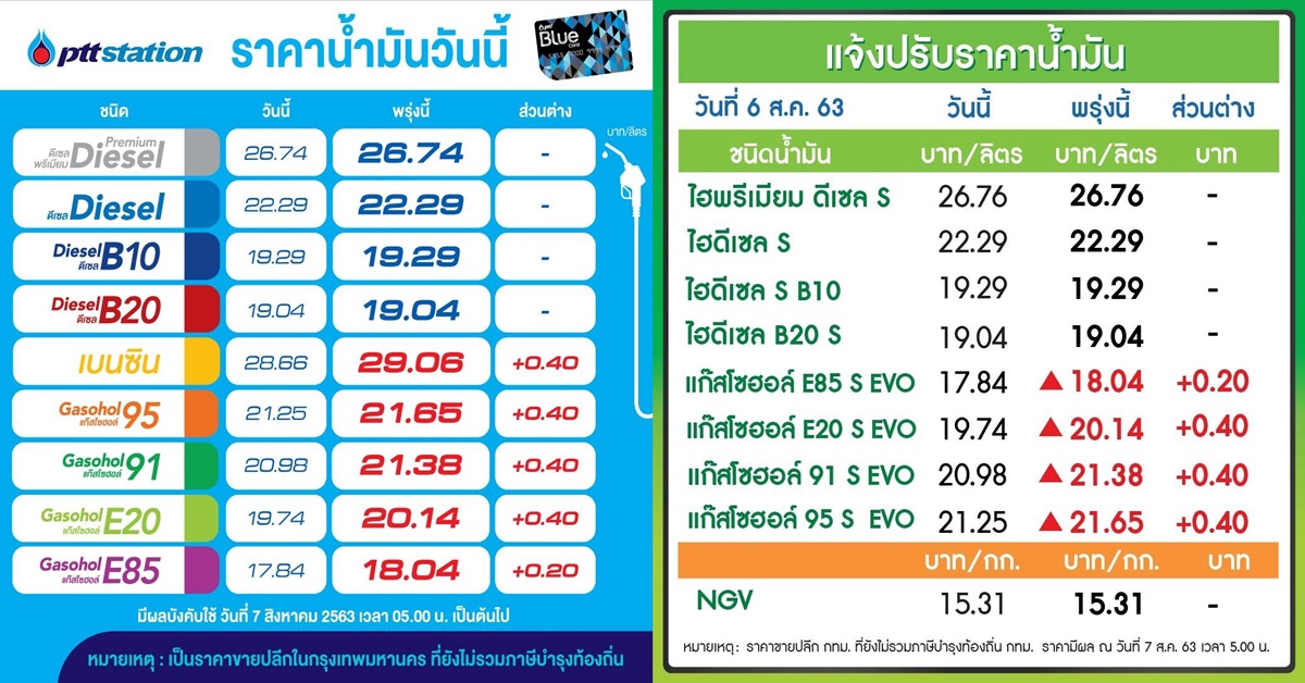 PTT Station และบางจากฯ ปรับราคาขายปลีกน้ำมันกลุ่มเบนซินและแก๊สโซฮอลล์ทุกชนิดเพิ่มขึ้น 40 สตางค์ต่อลิตร ยกเว้น E85 เพิ่มขึ้น 20 สตางค์ต่อลิตร ส่วนกลุ่มดีเซลทุกชนิดคงเดิม มีผล 7 สิงหาคม 2563 เวลา 05.00 น. เป็นต้นไป โดยราคาขายปลีกจะเป็นดังนี้ เบนซิน 29.06 บาท แก๊สโซฮอล์ 95 อยู่ที่ 21.65 บาท E20 อยู่ที่ 20.14 บาท แก๊สโซฮอล์ 91 อยู่ที่ 21.38 บาท E85 อยู่ที่ 18.04 บาท ดีเซล 22.29 บาท B10 อยู่ที่ 19.29 บาท B20 อยู่ที่ 19.04 บาท และดีเซลพรีเมี่ยม 26.74 บาทต่อลิตร โดยราคาขายปลีกข้างต้นยังไม่รวมภาษีบำรุงกรุงเทพมหานคร.-สำนักข่าวไทย