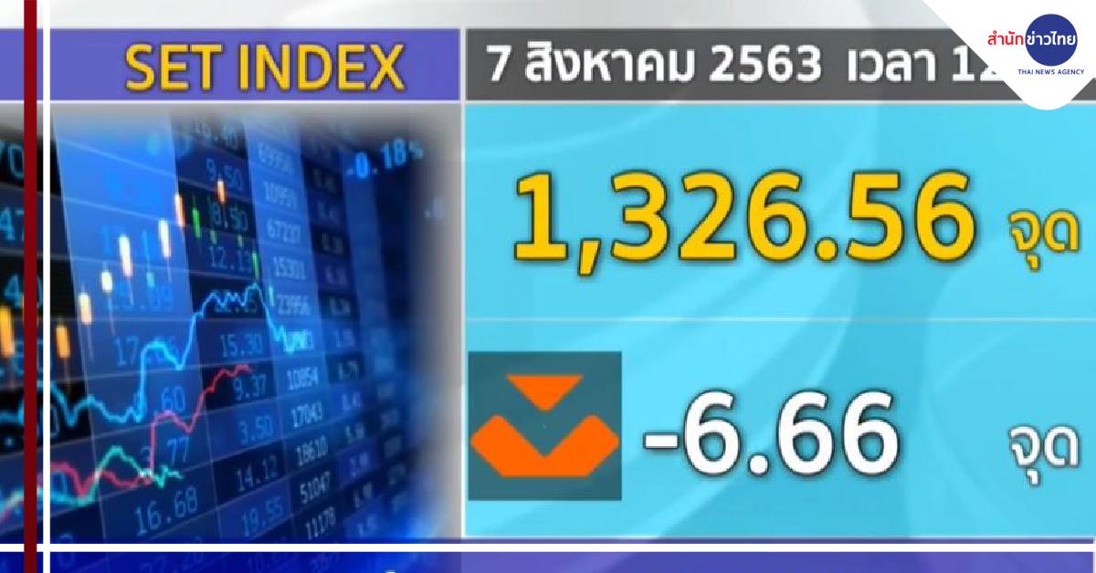 หุ้นไทยภาคเช้าวันนี้แกว่งแคบๆ ยังไม่มีปัจจัยใหม่เข้ามากระตุ้น ขณะเดียวกันก็รอดูตัวเลขการจ้างงานนอกภาคเกษตรของสหรัฐคืนนี้ ซึ่งตลาดคาดว่าจะเพิ่มขึ้น และรอดูแผนกระตุ้นเศรษฐกิจรอบใหม่ของสหรัฐ โดยช่วงเช้าหุ้นไทยร่วงไปถึง 10 จุด แต่ช่วงเที่ยงดีดกลับขึ้นมาเล็กน้อย ลบไป 6.66 จุด อยู่ที่ 1,326.56 จุด มูลค่าการซื้อขาย 19,890.73 ล้านบาท