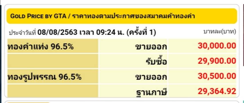 สมาคมค้าทองคำรายงาน ราคาทองคำในวันเสาร์ที่ 8 ส.ค.63 ครั้งที่ 1 ราคาลดลง 300 บาท โดยราคาทองคำแท่ง ซื้อข้า 29,900 บาท และขายออก30,000 บาท
