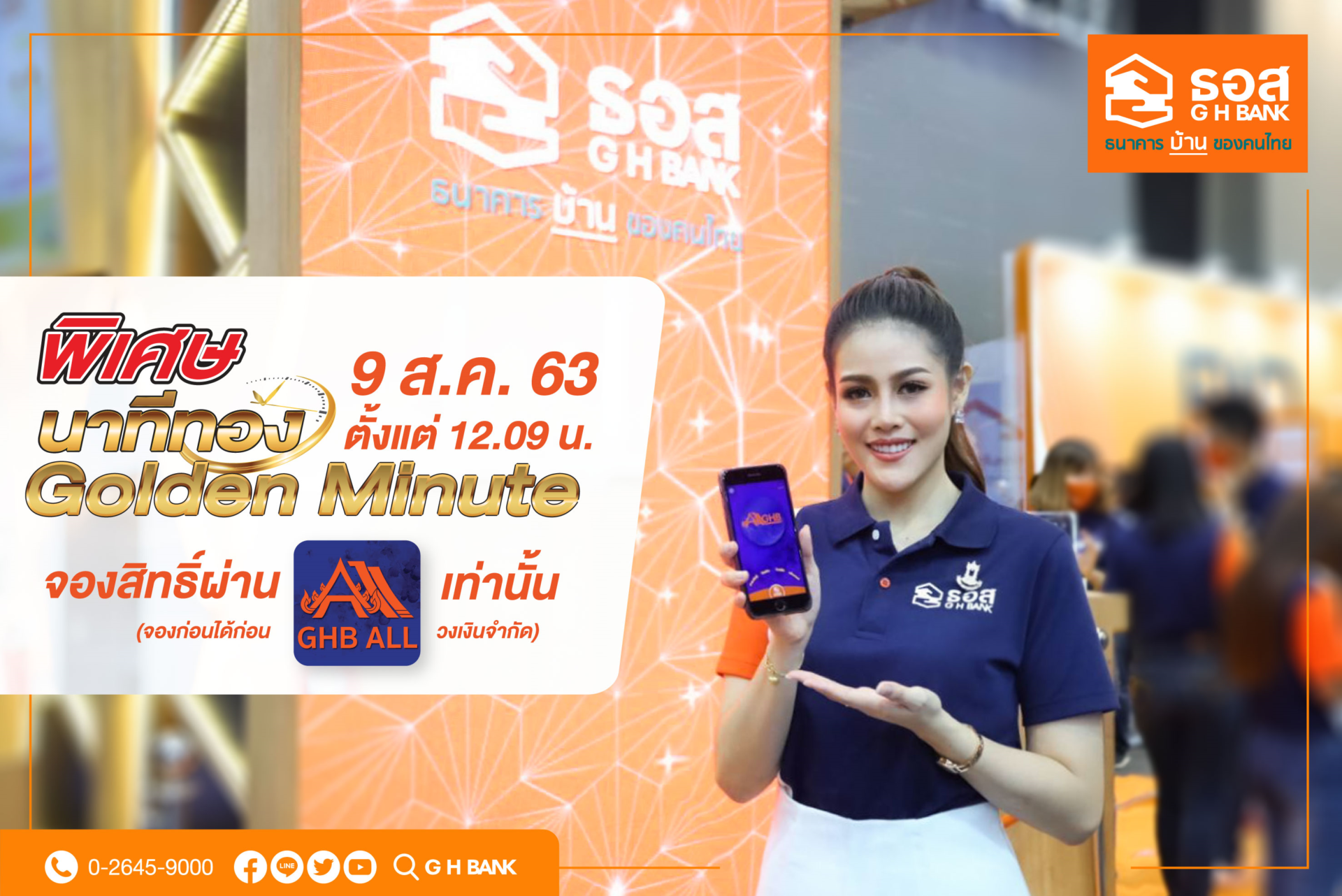 ธนาคารอาคารสงเคราะห์(ธอส.) แจ้งว่า ได้ จัดช่วงนาทีทอง Golden minute เปิดโอกาสให้ประชาชนที่ต้องการมีบ้าน ทั่วประเทศ จองสิทธิ์สินเชื่อแบบ New Normal ผ่าน Application : GHB ALL ในวันอาทิตย์ที่ 9 สิงหาคม 2563 ตั้งแต่เวลา 12.09 น. เป็นต้นไป จนกว่าจะเต็มกรอบวงเงิน 900 ล้านบาท (จองก่อนได้ก่อน) อัตราดอกเบี้ยพิเศษ 0% ต่อปี นาน 9 เดือนแรก เดือนที่ 10-36 อัตราดอกเบี้ย MRR ลบ 3.16% ต่อปี (ปัจจุบัน MRR เท่ากับ 6.150% ต่อปี) และเดือนที่ 37-39 อัตราดอกเบี้ย 0% ต่อปี เฉลี่ย 3 ปี 3 เดือนอัตราดอกเบี้ยเพียง 2.07% เท่านั้น วงเงินให้กู้รายละไม่เกิน 5 ล้านบาทต่อหลักประกัน
