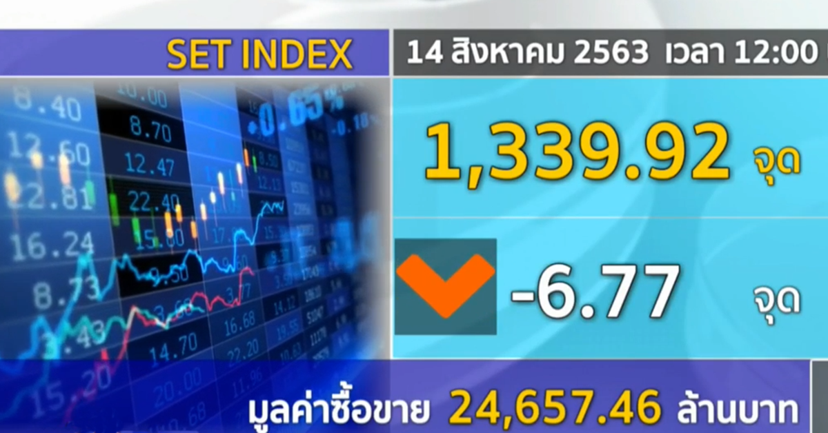 ตลาดหุ้นไทยช่วงเช้าวันนี้ (14 ส.ค.) ดัชนีอ่อนลงตามภูมิภาค จากแรงขายทำกำไรก่อนเจรจาการค้าสหรัฐ-จีน ที่จะมีขึ้นในวันที่ 15 ส.ค.นี้ ซึ่งจะมีผลต่อเศรษฐกิจโลก นักลงทุนยังรอดู GDP ไตรมาส 2 ของไทย ที่สภาพัฒน์ฯ จะประกาศในวันจันทร์นี้ (17 ส.ค.) ดัชนีช่วงเที่ยงอยู่ที่ 1,339.92 จุด ลดลง 6.77 จุด มูลค่าการซื้อขายกว่า 24,000 ล้านบาท