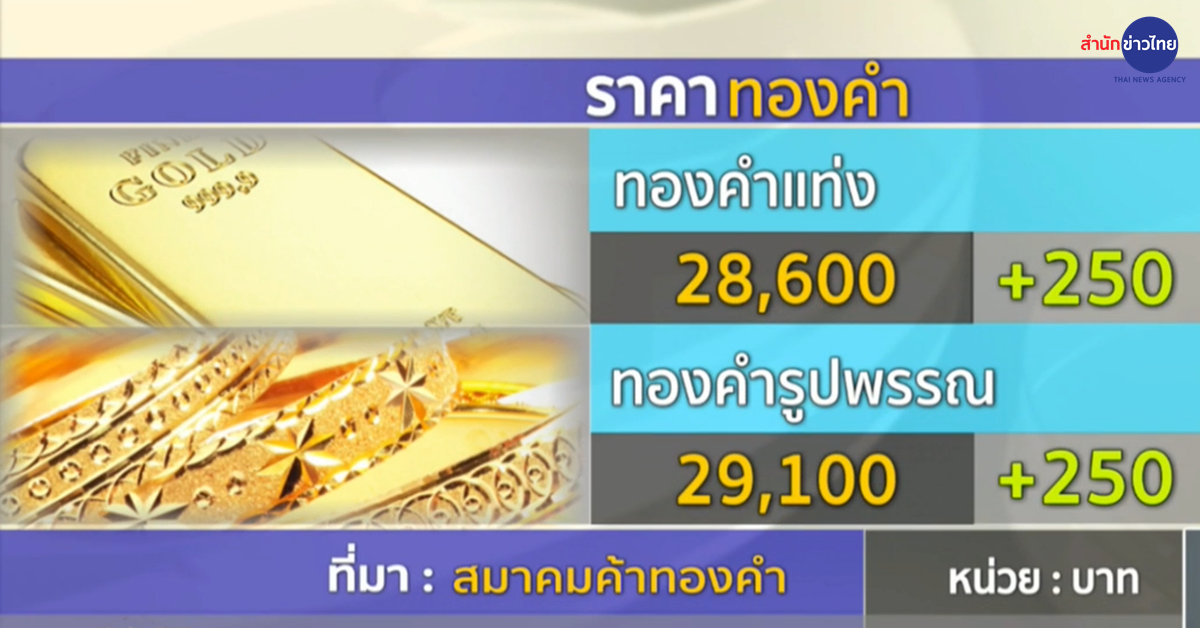 ด้านราคาทองคำเช้านี้ ปรับเพิ่มขึ้นบาทละ 250 บาท ทองคำแท่ง ขายออกที่บาทละ 28,600 บาท ทองรูปพรรณ ขายออกที่บาทละ 29,100 บาท. – สำนักข่าวไทย