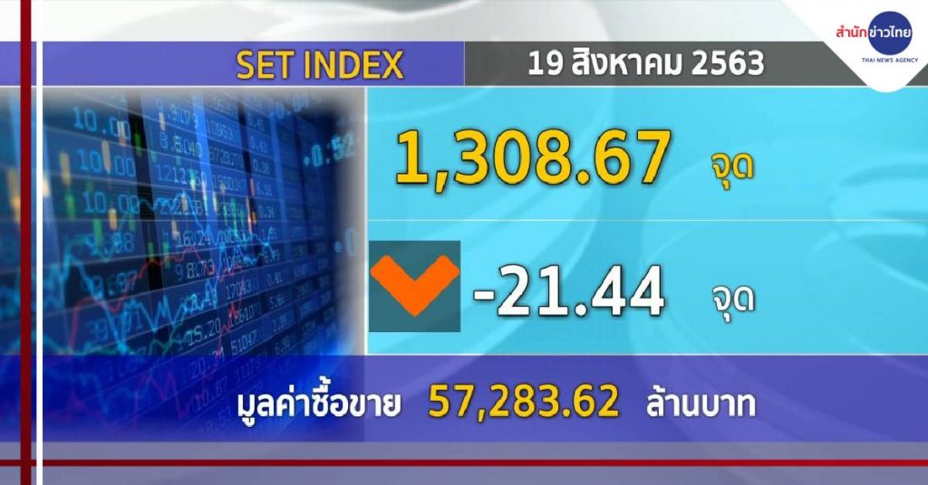 กรุงเทพฯ 19 ส.ค. – หุ้นไทยร่วง 21.44 จุด ดัชนีปิดที่ 1,308.67 จุด รับแรงกดดันพบผู้ติดเชื้อโควิด-19 ในไทย
