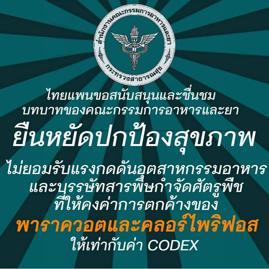 สำหรับในเพจของไทยแพนโพสต์ว่า ไทยแพนร่วมให้ความคิดเห็นทั้งทางเอกสารและหารือกับ อย. มาโดยตลอดว่า เมื่อแบนสารทั้ง 2 ชนิดแล้วจะต้องไม่พบการตกค้างในอาหารตามแนวปฏิบัติที่ผ่านมา ล่าสุดเมื่อวันที่ 17 สิงหาคม 2563 อย.ได้พิจารณาและมีข้อสรุป ดังนี้ 1. เพิ่มรายชื่อของพาราควอตและคลอร์ไพริฟอส ในบัญชีหมายเลข 1 (รายการสารที่แบนแล้ว) ของประกาศกระทรวง เรื่อง อาหารที่มีสารพิษตกค้าง 2. ยกเลิกค่าการตกค้างที่อนุญาตให้พบในอาหาร (Maximum Residue Limit-MRL) โดยต้องตรวจไม่พบสารพิษตกค้างจากวัตถุอันตรายที่ยกเลิกแล้ว (Not Detected) และ 3. มีผลบังคับใช้ 1 มิถุนายน 2564 กับอาหารที่ผลิตในประเทศและนำเข้าต้องปฏิบัติตามประกาศฉบับนี้