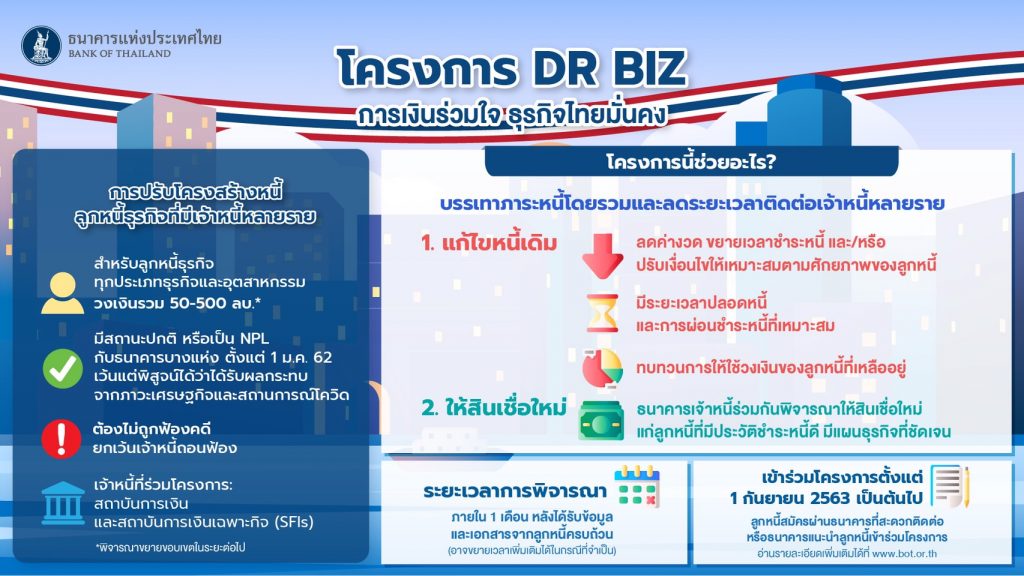 นายวิรไท สันติประภพ ผู้ว่าการธนาคารแห่งประเทศไทย (ธปท.) กล่าวว่า มีผู้ประกอบการจำนวนมากที่มีเจ้าหนี้หลายรายและต้องการปรับโครงสร้างหนี้ แต่ประสบปัญหาความล้มเหลวในการประสานงาน และยังพบปัญหาเรื่องของกรอบเวลาการทำงานที่ล่าช้า ส่งผลต่อการตัดสินใจของสถาบันการเงินรายอื่นที่เป็นเจ้าหนี้ ซึ่งขณะนี้มีลูกหนี้ธุรกิจที่มีเจ้าหนี้หลายรายวงเงินรวมหนี้ตั้งแต่ 50-500 ล้านบาท ประมาณ 8,400 คน คิดเป็นเม็ดเงินรวมเกือบ 1.2 ล้านล้านบาท โดยโครงการ DR BIZ การเงินร่วมใจ ธุรกิจไทยมั่งคง จะเป็นการเข้าไปช่วยปรับโครงสร้างหนี้ลูกหนี้ธุรกิจที่มีเจ้าหน้าหนี้หลายราย ซึ่งจะมีการกำหนดมาตรฐานและกรอบเวลาที่ชัดเจนในการดำเนินการช่วยเหลือลูกหนี้ หรือภายใน 1 เดือน หลังได้รับข้อมูลและเอกสารจากลูกหนี้ครบถ้วน ซึ่งคาดว่าจะมีลูกหนี้ที่ได้รับประโยชน์จากโครงการนี้ไม่ต่ำกว่า 1,000 ราย