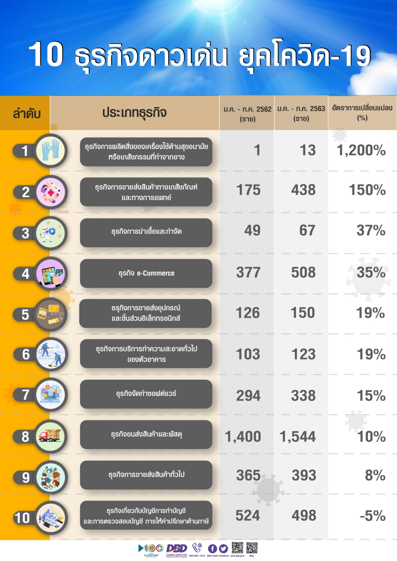 สำหรับ 10 ธุรกิจดาวเด่น พิจารณาจากมีผู้ประกอบธุรกิจมาจดทะเบียนจัดตั้งธุรกิจเพิ่มสูงขึ้นจากช่วงเวลาเดียวกันของปีที่ผ่านมา (ม.ค.-ก.ค.62) แม้อยู่ในช่วงสถานการณ์การแพร่ระบาดของโรคโควิด-19 ประกอบด้วย 1) ธุรกิจการผลิตสิ่งของเครื่องใช้ด้านสุขอนามัยหรือเภสัชกรรมที่ทำจากยาง จำนวน 13 บริษัท เพิ่มขึ้น 12 เท่า (ม.ค.-ก.ค.62 จำนวน 1 บริษัท) 2) ธุรกิจการขายส่งสินค้าทางเภสัชภัณฑ์และทางการแพทย์ จำนวน 438 บริษัท เพิ่มขึ้นร้อยละ 150 (ม.ค.-ก.ค.62 จำนวน 175 บริษัท) 3) ธุรกิจการฆ่าเชื้อและกำจัด จำนวน 67 บริษัท เพิ่มขึ้นร้อยละ 37 (ม.ค.-ก.ค.62 จำนวน 49 บริษัท) 4) ธุรกิจ e-Commerce จำนวน 508 บริษัท เพิ่มขึ้นร้อยละ 35 (ม.ค.-ก.ค.62 จำนวน 377 บริษัท) 5) ธุรกิจการขายส่งอุปกรณ์และชิ้นส่วนอิเล็กทรอนิกส์ จำนวน 150 บริษัท เพิ่มขึ้นร้อยละ 19 (ม.ค.-ก.ค.62 จำนวน 126 บริษัท)