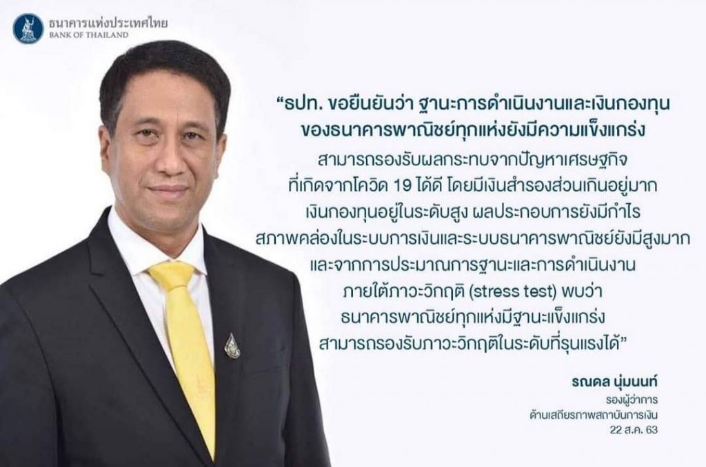 ธปท. ขอยืนยันว่าฐานะการดำเนินงานและเงินกองทุนของธนาคารพาณิชย์ทุกแห่งยังมีความแข็งแกร่งและสามารถรองรับผลกระทบจากปัญหาเศรษฐกิจที่เกิดจากโควิด 19 ได้ดี โดยตั้งแต่ต้นปี 2563 ระบบธนาคารพาณิชย์มีเงินสำรองส่วนเกินอยู่มากจากนโยบายการกันสำรองอย่างเข้มงวดในช่วงหลายปีที่ผ่านมา โดย ณ สิ้นมิถุนายน 2563 อัตราส่วนเงินกองทุนต่อสินทรัพย์เสี่ยง (BIS ratio) ของระบบธนาคารพาณิชย์ อยู่ที่ระดับสูงถึงร้อยละ 19.2 และผลประกอบการยังมีกำไร รวมทั้งสภาพคล่องในระบบการเงินและระบบธนาคารพาณิชย์ยังมีสูงมากด้วย