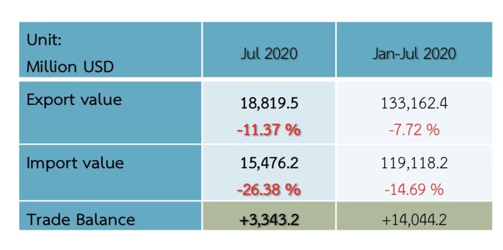 ขณะที่ยอดนำเข้าเดือนกรกฎาคม 2563 อยู่ที่ 15,476.2 ล้านดอลลาร์สหรัฐ เทียบกับช่วงเดียวกันปีก่อนติดลบร้อยละ 26.38 ส่งผลให้ยอดนำเข้า7 เดือน อยู่ที่ 119,118 .2 ล้านดอลลาร์สหรัฐ เทียบกับช่วงเดียวกันปีก่อนลดลงร้อยละ 14.69 ส่งผลให้ไทยยังได้ดุลการค้าเดือนกรกฎาคม 2563 อยู่ที่ 3,343.2 ล้านดอลลาร์สหรัฐ ทำให้การค้า 7 เดือน อยู่ที่ 14,044.2 ล้านดอลลาร์สหรัฐ