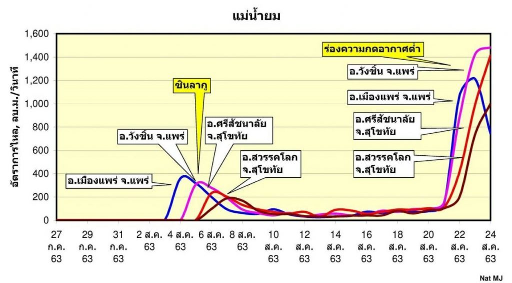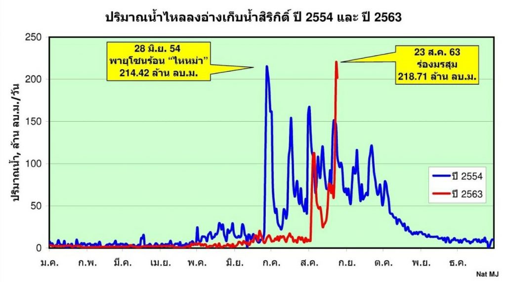 นายณัฐ มาแจ้ง อาจารย์ภาควิชาวิศวกรรมทรัพยากรน้ำ มหาวิทยาลัยเกษตรศาสตร์ กล่าวว่า พื้นที่ลุ่มน้ำยมมีความเสี่ยงน้ำท่วมมาก แม้ไม่มีพายุเข้าไทย โดยช่วง 3-4 วันที่ผ่านมาฝนตกหนักต่อเนื่องจากร่องความกดอากาศต่ำกำลังแรงพาดผ่านภาคเหนือ โดยเฉพาะ จ.น่าน ซึ่งเป็นต้นน้ำของแม่น้ำน่าน และ จ.แพร่ ต้นน้ำของแม่น้ำยม เมื่อเปรียบเทียบกับปี 2554 มีพายุเข้า 5 ลูก ได้แก่ ไหหม่า ต่อด้วยนกเตน ไห่ถาง เนสาด และนาลแก ทำน้ำลุ่มน้ำน่านไหลลงอ่างเก็บน้ำเขื่อนสิริกิติ์ จ.อุตรดิตถ์ สูงสุด 214.42 ล้านลูกบาศก์เมตร (ลบ.ม.) ต่อวัน แต่เมื่อวานนี้ (23 ส.ค.) มีน้ำไหลลงอ่างสูงถึง 218.71 ล้าน ลบ.ม. มากกว่าปี 2554