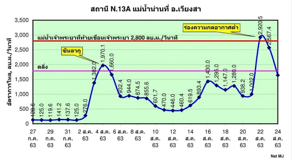 ส่วนน้ำท่วมใหญ่ อ.เวียงสานั้น เนื่องจากฝนตกลงมาวัดได้มากกว่าฝนจากพายุซินลากูถึง 1.5 เท่า โดยอัตราการไหลของน้ำผ่านสถานี N.13A อ.เวียงสา เมื่อวันที่ 22 สิงหาคม 2,920 ลบ.ม./วินาที ซึ่งมากกว่าความสามารถรับน้ำสูงสุดของแม่น้ำเจ้าพระยา จ.ชัยนาท ซึ่งท้ายเขื่อนเจ้าพระยารับได้สูงสุด 2,800 ลบ.ม./วินาที