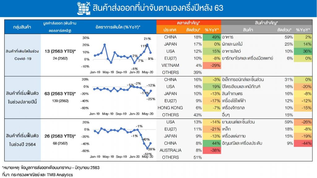 TMB Analytics ทำการวิเคราะห์แนวโน้มการส่งออกสินค้าไทยในช่วงครึ่งปีหลัง 2563 โดยประเมินจากปัจจัยลักษณะสินค้าและทิศทางการฟื้นตัวของอุปสงค์ ได้แก่ ความจำเป็นของลักษณะสินค้าบริโภค นโยบายปลดล็อกประเทศในโครงสร้างตลาดส่งออก ภาวะตลาดส่งออกก่อนเกิดการระบาด ฯลฯ ซึ่งจากการประเมินแบ่งการฟื้นตัวของการส่งออก 3 กลุ่ม ดังนี้