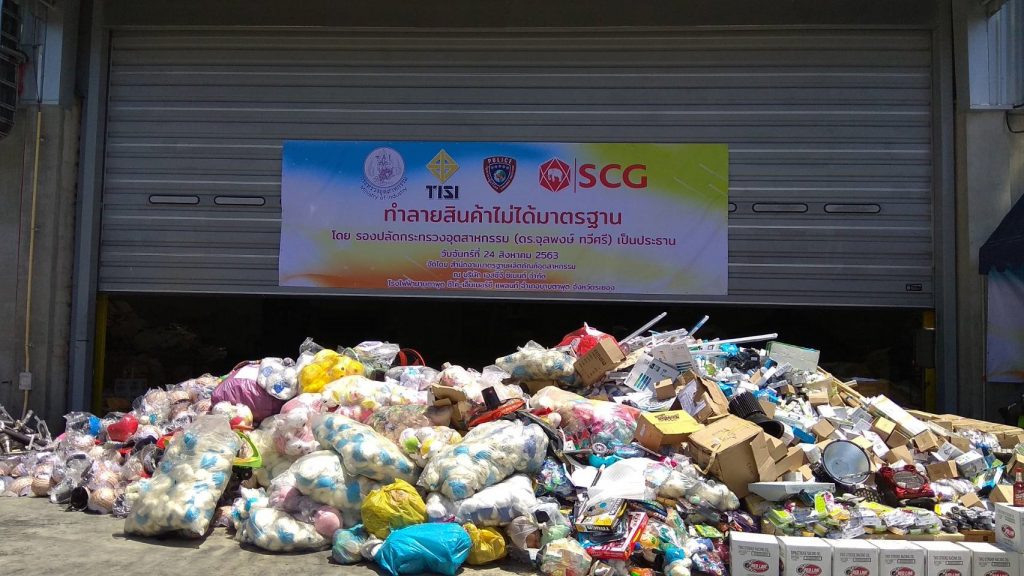 นายจุลพงษ์ ทวีศรี ประธานคณะกรรมการมาตรฐานผลิตภัณฑ์อุตสาหกรรม (กมอ.) เปิดเผยว่า ตั้งแต่วันที่ 1 ตุลาคม 2562 – 31 กรกฎาคม 2563 ได้อายัดสินค้าที่ไม่เป็นไปตามมาตรฐานทั้งจำหน่ายในท้องตลาดและทางออนไลน์มูลค่ากว่า 1,000 ล้านบาท แบ่งเป็นสินค้า 7 ประเภท คือ 1.เหล็กและวัสดุก่อสร้าง 2.เครื่องใช้ไฟฟ้าและอิเล็กทรอนิกส์ เช่น ไดร์เป่าผม เตารีด เต้ารับเต้าเสียบ พัดลม เตาปิ้ง เตาย่าง กระติกน้้าร้อน หม้อหุงข้าว หลอดไฟ และกระทะ 3. ยานยนต์และชิ้นส่วนยานยนต์ ได้แก่ ยางล้อ ท่อไอเสียรถจักรยานยนต์ 4. ปิโตรเลียม เคมี และพอลิเมอร์ เช่น หมวกกันน็อค ถังน้ำพลาสติก ท่อพีวีซี และฟิล์มหุ้มอาหาร 5. ผลิตภัณฑ์โภคภัณฑ์ ได้แก่ ของเล่น 6. ผลิตภัณฑ์อาหาร เช่น น้ำดื่ม วุ้นเส้น และ 7. ผลิตภัณฑ์เครื่องมือแพทย์ ได้แก่ ถุงมือทางการแพทย์ สินค้าเหล่านี้เมื่อคดีสิ้นสุดแล้ว จะเข้าสู่กระบวนการทำลายที่ได้มาตรฐาน เหมาะสม และไม่ส่งผลกระทบต่อสิ่งแวดล้อม