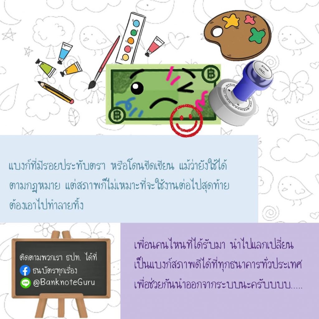 ธนบัตรที่มีรอยประทับตราหรือขีดเขียนข้อความใด ๆ ยังสามารถใช้ชำระหนี้ได้ตามกฎหมาย แต่ไม่ควรนำออกใช้ต่อไป เพราะมีสภาพไม่เหมาะสมต่อการใช้หมุนเวียน เนื่องจากรอยเปรอะเปื้อนอาจทำให้พิสูจน์ได้ยากว่าเป็นธนบัตรจริงหรือธนบัตรปลอม ซึ่ง ธปท.จะดำเนินการนำออกจากระบบและพิมพ์ธนบัตรใหม่ทดแทน เพื่อให้ธนบัตรหมุนเวียนเพื่อการใช้งานของประชาชนเป็นธนบัตรที่สะอาดและน่าใช้ตามมาตรฐานที่ ธปท.ได้กำหนดไว้
