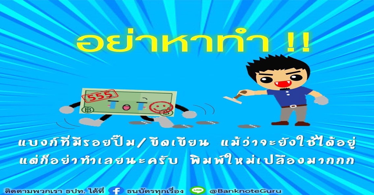 ธปท.ขอความร่วมมือประชาชนให้ใช้ธนบัตรอย่างถูกวิธี ไม่ควรทำให้ธนบัตรชำรุดเสียหายโดยการประทับตราหรือขีดเขียนใด ๆ ลงบนธนบัตร ซึ่งจะช่วยลดการสูญเสียงบประมาณและทรัพยากรของประเทศในการแลกเปลี่ยน ทำลาย ตลอดจนพิมพ์ใหม่เพื่อทดแทนโดยไม่จำเป็น หากประชาชนได้รับธนบัตรดังกล่าว ขอให้นำไปแลกเปลี่ยนเป็นธนบัตรสภาพดีได้ที่สาขาธนาคารออมสิน และธนาคารพาณิชย์ เพื่อนำออกจากระบบต่อไป.-สำนักข่าวไทย