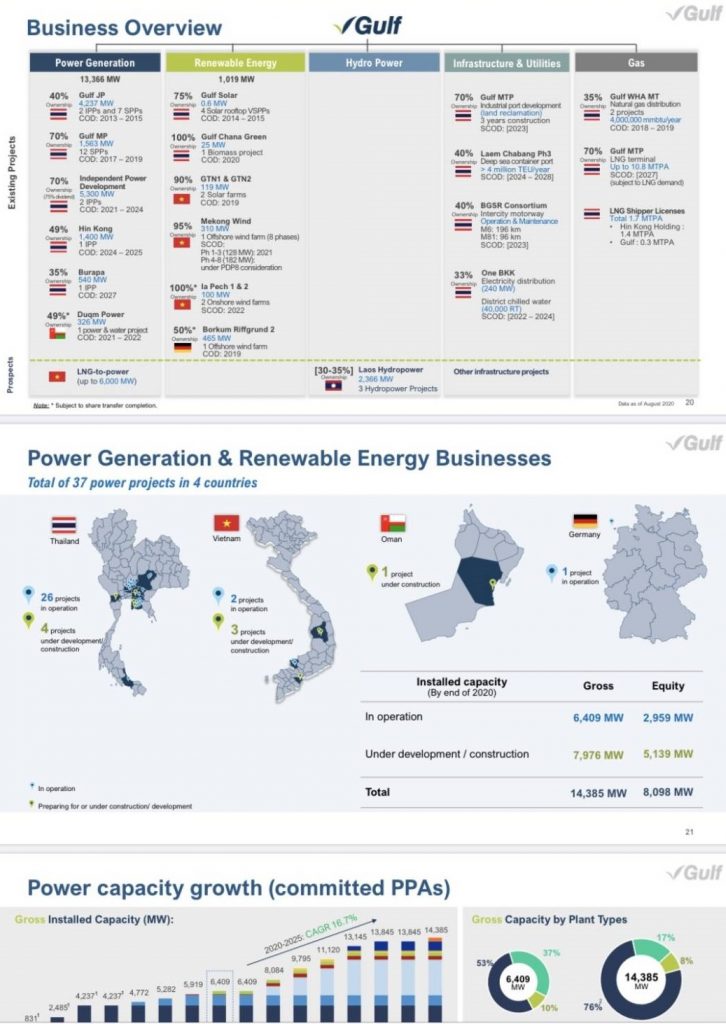 ส่วนเป้าหมายการเพิ่มกำลังการผลิตไฟฟ้าติดตั้งที่บริษัทร่วมทุนด้วยยังเป็นไปตามเป้าหมายเดิม 10,000 เมกะวัตต์ ภายในปี 2565 โดยปัจจุบันมีกำลังผลิตที่เดินเครื่องแล้ว 6,409 เมกะวัตต์ และเมื่อรวมกับโครงการที่กำลังพัฒนารวมเป็น 7,976 เมกะวัตต์ โดยโครงการใหม่ที่พยายามเจรจาจะเป็นโครงการที่เดินเครื่องแล้ว เพื่อสร้างรายได้ได้ทันที เช่น โครงการพลังงานลมในทะเลที่เยอรมนี 464.8 เมกะวัตต์ ลงทุนประมาณเกือบ 2,000 ล้านบาทจะเริ่มรับรู้รายได้ไตรมาส 4/2563 คาดสร้างกำไรแก่บริษัทประมาณ 1,500-2,000 ล้านบาท/ปี และยังเจรจาโครงการใน สปป.ลาว เป็นโรงไฟฟ้าพลังน้ำ 3 โครงการ กว่า 2,000 เมกะวัตต์ ส่วนโครงการไอพีพีในไทย 3 โครงการหลักรวม 6,940 เมกะวัตต์ จะทยอยเข้าระบบปี 2564-2570ประกอบด้วย โครงการที่กลุ่มกัลฟ์ชนะประมูล 5,000 เมกะวัตต์ โครงการหินกอง 5,000 เมกะวัตต์และโครงการบูรพา 540 เมกะวัตต์ ส่วนโครงการนำเข้าก๊าซธรรมชาติเหลว (แอลเอ็นจี) ยังเป็นไปตามแผนเดิมต้นทุนนำเข้าต่ำเกิดการแข่งขันเป็นประโยชน์ต่อประชาชน.-สำนักข่าวไทย