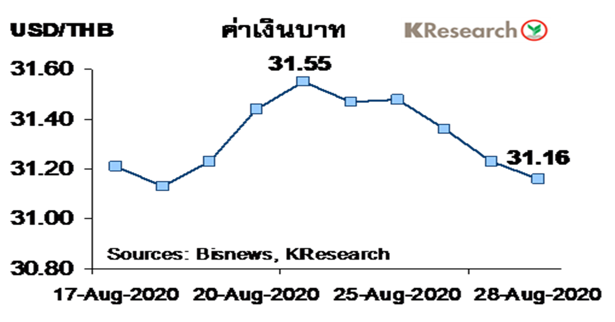 บริษัท ศูนย์วิจัยกสิกรไทย จำกัด รายงาน ว่าสัปดาห์ที่ผ่านมาเงินบาทแข็งค่าขึ้น สอดคล้องกับทิศทางสกุลเงินเอเชียและเงินหยวน (หลังการหารือของสหรัฐฯ-จีนในเรื่องดีลการค้าเฟสแรกมีความคืบหน้า) ประกอบกับมีแรงหนุนจากปัจจัยทางเทคนิคหลังเงินบาทแข็งค่าผ่านหลายแนวสำคัญระหว่างสัปดาห์ ทั้งนี้เงินบาทยังคงแข็งค่าต่อเนื่องจนถึงปลายสัปดาห์ และแตะระดับแข็งค่าสุดในรอบกว่า 1 สัปดาห์ที่ 31.16 บาทต่อดอลลาร์ฯ ขณะที่เงินดอลลาร์ฯ กลับมาอ่อนค่าลง (จากที่ฟื้นตัวช่วงสั้นๆ หลังปาฐกถาของประธานเฟดเป็นไปตามที่ตลาดคาด) เนื่องจากตลาดมองว่า การเปลี่ยนมาใช้เป้าหมายเงินเฟ้อเฉลี่ยของเฟด จะทำให้เฟดคงอัตราดอกเบี้ยในระดับต่ำเป็นเวลานาน และจะไม่รีบปรับขึ้นดอกเบี้ยล่วงหน้าเพื่อสกัดความเสี่ยงเงินเฟ้อ