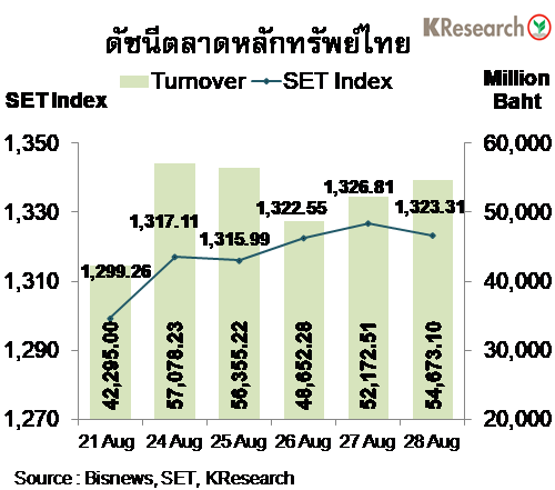 ขณะที่หุ้นไทยปรับตัวขึ้นจากสัปดาห์ก่อนแม้ลดช่วงบวกลงบางส่วนปลายสัปดาห์ โดยดัชนี SET ปิดที่ระดับ 1,323.31 จุด เพิ่มขึ้น 1.85% จากสัปดาห์ก่อน ขณะที่มูลค่าการซื้อขายเฉลี่ยต่อวันอยู่ที่ 53,786.27 ล้านบาท เพิ่มขึ้น 8.73% จากสัปดาห์ก่อน ส่วนดัชนี mai เพิ่มขึ้น 2.79% จากสัปดาห์ก่อน มาปิดที่ 310.77 จุด