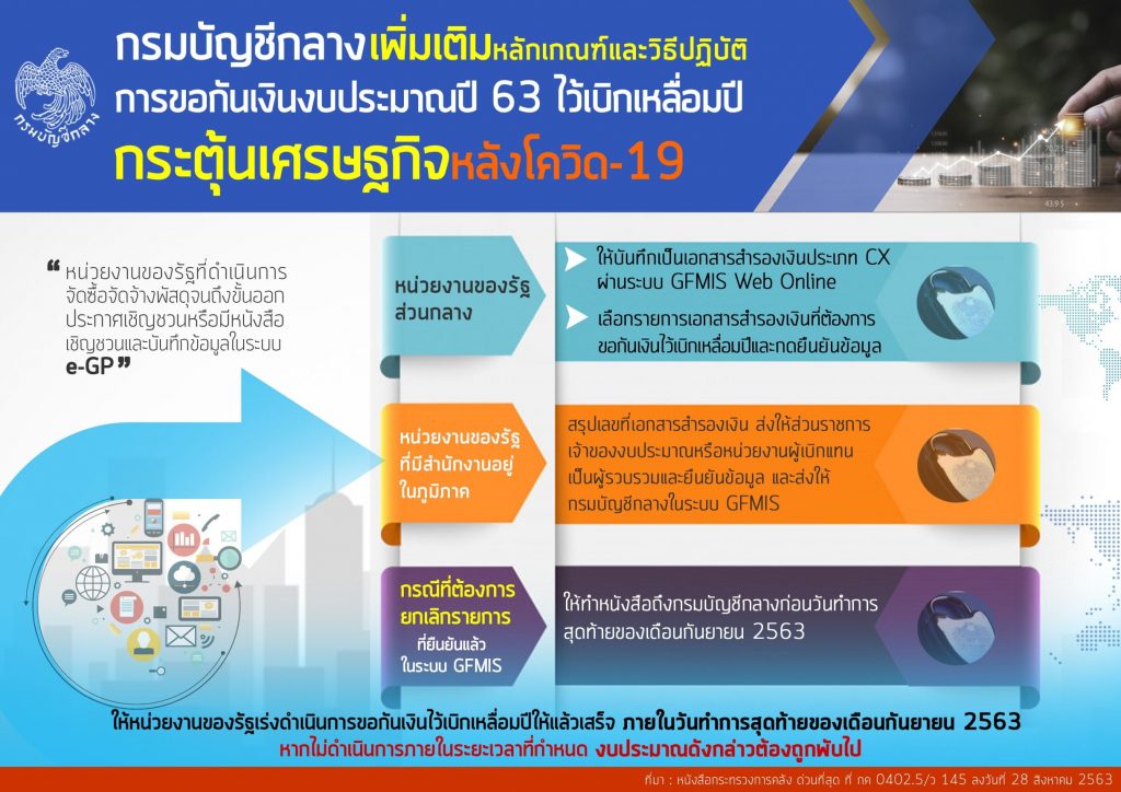 นายภูมิศักดิ์ อรัญญาเกษมสุข อธิบดีกรมบัญชีกลาง เปิดเผยว่า กรมบัญชีกลางได้รับมอบหมายจากกระทรวงการคลังให้ออกหลักเกณฑ์และวิธีปฏิบัติในการขอกันเงินงบประมาณปี พ.ศ.2563 ไว้เบิกเหลื่อมปี ตามหนังสือกระทรวงการคลัง ด่วนที่สุด ที่ กค 0402.5/ว 135 ลงวันที่ 14 สิงหาคม 2563 แต่เนื่องจากผลกระทบจากการแพร่ระบาดของโรคติดเชื้อไวรัสโคโรนา 2019 และพระราชบัญญัติงบประมาณรายจ่ายประจำปีงบประมาณ พ.ศ.2563 มีผลใช้บังคับล่าช้า ประกอบกับมีการจัดทำพระราชบัญญัติโอนงบประมาณรายจ่าย พ.ศ.2563 ซึ่งใช้บังคับเมื่อวันที่ 21 กรกฎาคม 2563 ส่งผลให้กระบวนการจัดหาพัสดุของหน่วยงานของรัฐล่าช้ากว่าปกติ ดังนั้น เพื่อเป็นการกระตุ้นเศรษฐกิจและส่งผลให้มีเม็ดเงินเข้าสู่ระบบเศรษฐกิจมากขึ้น กรมบัญชีกลางจึงออกหลักเกณฑ์และวิธีปฏิบัติในการขอกันเงินงบประมาณปี พ.ศ.2563 ไว้เบิกเหลื่อมปีเพิ่มเติม สรุปสาระสำคัญได้ดังนี้