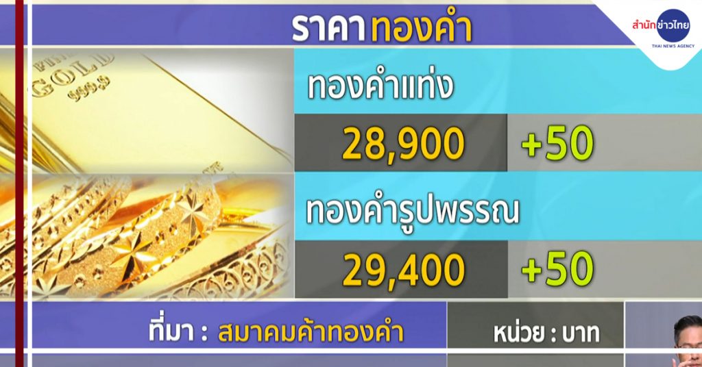 ส่วนราคาทองคำเช้านี้ เพิ่มขึ้น 50 บาท ราคาทองคำแท่งขายออกอยู่ที่บาทละ 28,900 บาท ทองรูปพรรณ ขายออก 29,400 บาท .- สำนักข่าวไทย