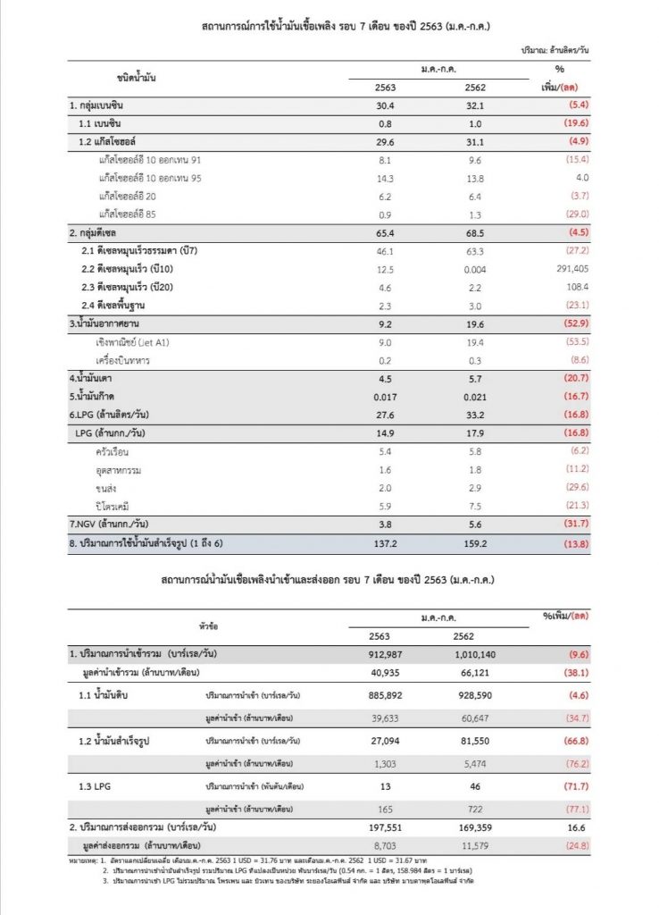 นางสาวนันธิกา ธังสุพานิช อธิบดีกรมธุรกิจพลังงาน เปิดเผยถึงภาพรวมการใช้น้ำมันเชื้อเพลิงเฉลี่ยต่อวันรอบ 7 เดือนของปี 2563 (มกราคม – กรกฎาคม) ลดลงเมื่อเทียบกับช่วงเวลาเดียวกันของปีก่อน คิดเป็นร้อยละ 13.8 เป็นผลพวงจากการแพร่ระบาดโควิด-19 อย่างไรก็ตามสถานการณ์ดีขึ้นตามลำดับหลังคลายล็อกดาวน์
