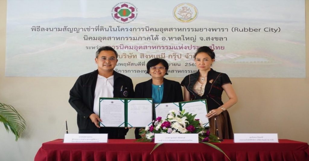 นางสาวสมจิณณ์ พิลึก ผู้ว่าการ การนิคมอุตสาหกรรมแห่งประเทศไทย (กนอ.) เปิดเผยว่า กนอ.ได้ลงนามในสัญญาเช่าที่ดินกับบริษัท สิงหเสนี กรุ๊ป จำกัด ซึ่งร่วมทุนกับบริษัท แอทยีนส์ โกลบอล ลิงค์ จำกัด ในพื้นที่โครงการนิคมอุตสาหกรรมยางพาราในนิคมอุตสาหกรรมภาคใต้ ตำบลฉลุง อำเภอหาดใหญ่ จังหวัดสงขลา เนื้อที่ประมาณ 83 ไร่ เพื่อประกอบกิจการโรงงานผลิตถุงมือยางจากน้ำยางธรรมชาติซึ่งเป็นส่วนหนึ่งของอุปกรณ์ทางการแพทย์ โดยจะใช้น้ำยางธรรมชาติเป็นวัตถุดิบหลักประมาณ 3,600 ตันต่อเดือน หรือประมาณ 43,200 ตันต่อปี ในพื้นที่จังหวัดสงขลาและจังหวัดใกล้เคียง เป็นการตอบสนองนโยบายรัฐบาลที่ส่งเสริมการลงทุนในอุตสาหกรรมเครื่องมือแพทย์และช่วยยกระดับผลผลิตยางพาราในพื้นที่ภาคใต้ให้เป็นสินค้าที่มีมูลค่าสูงขึ้น โดยคาดว่าจะก่อสร้างเสร็จพร้อมเปิดดำเนินการเดือนเมษายน 2564