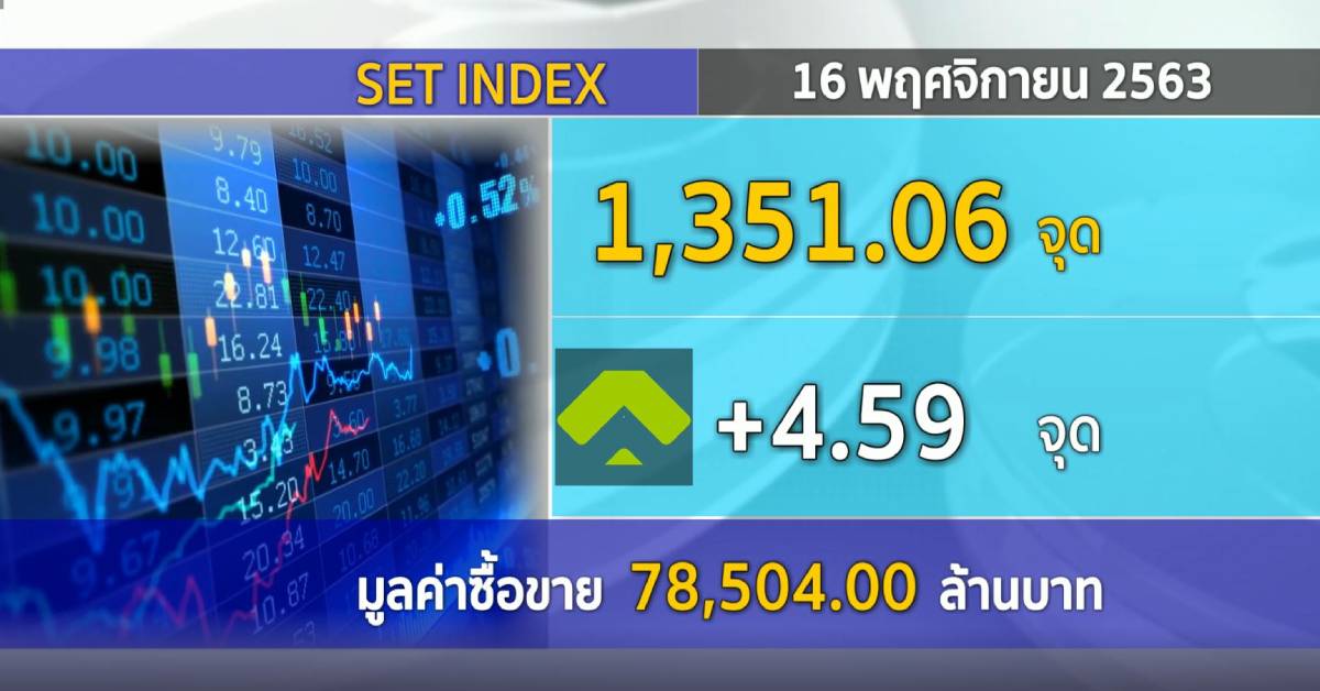กทม. 16 พ.ย.-ตลาดหลักทรัพย์ปิดวันนี้ที่ระดับ 1,351.06 จุด เพิ่มขึ้น 4.59 จุด (+0.34%) มูลค่าการซื้อขาย 78,504.00 ล้านบาท