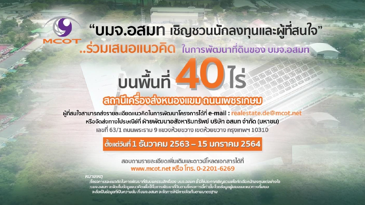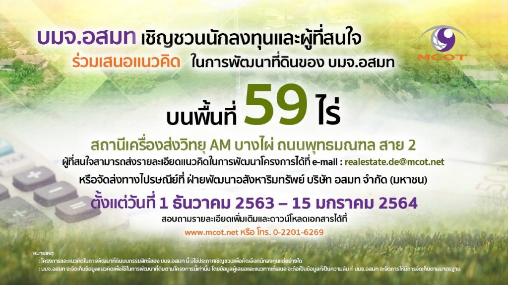 อสมท ขอประชาสัมพันธ์เชิญชวนนักลงทุนและผู้ที่สนใจร่วมเสนอแนวคิดในการพัฒนาที่ดินกรรมสิทธ์ของ อสมท บนพื้นที่ 59 ไร่ สถานีเครื่องส่งวิทยุ AM บางไผ่ ถนนพุทธมณฑลสาย 2 และ ร่วมเสนอแนวคิดในการพัฒนาที่ดินกรรมสิทธิ์ของ อสมท บนพื้นที่ 40ไร่ สถานีเครื่องส่งหนองแขม ถนนเพชรเกษม โดยผู้ที่สนใจสามารถส่งรายละเอียดแนวคิดในการพัฒนาโครงการได้ที่ e-mail : realestate.de@mcot.net หรือจัดส่งทางไปรษณีย์ที่ ฝ่ายพัฒนาอสังหาริมทรัพย์ บริษัท อสมท จำกัด (มหาชน) เลขที่ 63/1 ถนนพระราม 9 แขวงห้วยขวาง เขตห้วยขวาง กรุงเทพฯ 10310 ตั้งแต่วันที่ 1 ธันวาคม 2563-15 มกราคม 2564 สามารถสอบถามรายละเอียดเพิ่มเติมและดาวน์โหลดเอกสารได้ที่ www.mcot.net โทร. 0-2201-6269 . – สำนักข่าวไทย