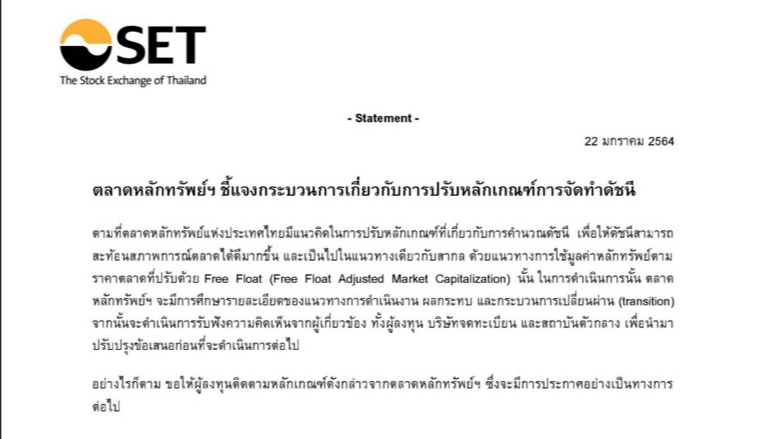 ตลาดหลักทรัพย์แห่งประเทศไทย (SET ) ออกแถลงการณ์ว่า ตามที่ ตลท.มีแนวคิดในการปรับหลักเกณฑ์ที่เกี่ยวกับการคำนวณดัชนี เพื่อให้ดัชนีสามารถสะท้อนสภาพการณ์ตลาดได้ดีมากขึ้น และเป็นไปในแนวทางเดียวกับสากล ด้วยแนวทางการใช้มูลค่าหลักทรัพย์ตามราคาตลาดที่ปรับด้วย Free Float (Free Float Adjusted Market Capitalization) นั้น ในการดำเนินการนั้น ตลาดหลักทรัพย์ฯ จะมีการศึกษารายละเอียดของแนวทางการดำเนินงาน ผลกระทบ และกระบวนการเปลี่ยนผ่าน (transition) จากนั้นจะดำเนินการรับฟังความคิดเห็นจากผู้เกี่ยวข้อง ทั้งผู้ลงทุน บริษัทจดทะเบียน และสถาบันตัวกลาง เพื่อนำมาปรับปรุงข้อเสนอก่อนที่จะดำเนินการต่อไป อย่างไรก็ตาม ขอให้ผู้ลงทุนติดตามหลักเกณฑ์ดังกล่าวจากตลาดหลักทรัพย์ฯ ซึ่งจะมีการประกาศอย่างเป็นทางการต่อไป
