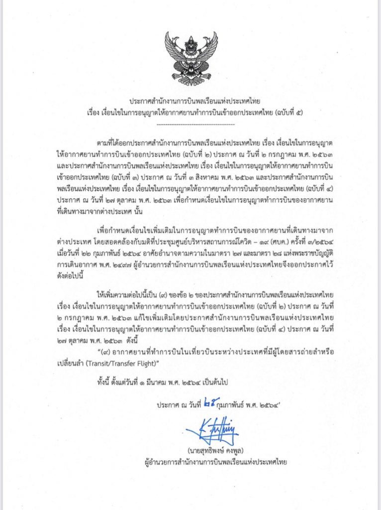 นายศักดิ์สยาม ชิดชอบ รัฐมนตรีว่าการกระทรวงคมนาคม เปิดเผยว่าสำนักงานการบินพลเรือนแห่งประเทศไทย หรือ กพท. ได้ออกประกาศให้อากาศยานที่ทำการบินระหว่างประเทศที่มีผู้โดยสารถ่ายลำหรือเปลี่ยนลำ (Transit/Transfer flight) สามารถบินเข้าประเทศไทยได้ จากเดิมมีประกาศฯ ห้ามไว้อยู่ ซึ่งจะเริ่มมีผลตั้งแต่วันที่ 1 มี.ค.64 เป็นต้นไป