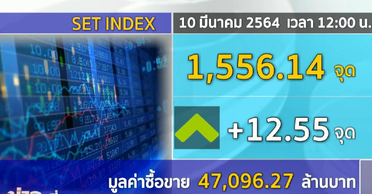กทม. 10 มี.ค.-ตลาดหุ้นไทยในภาคเช้าเพิ่มขึ้น 7.56 จุด อยู่ที่ระดับ 1556.25 จุด ส่วนดัชนีช่วงเที่ยง เพิ่มขึ้น 12.55 จุด ดัชนีช่วงเที่ยงอยู่ที่ 1556.14 จุด มูลค่าซื้อขายอยู่ที่ 47,096.27 ล้าบาท