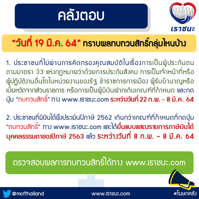 กรุงเทพฯ 18 มี.ค. – น.ส.กุลยา ตันติเตมิท ผู้อำนวยการสำนักงานเศรษฐกิจการคลัง ในฐานะโฆษกกระทรวงการคลัง เปิดเผยความคืบหน้าการประกาศผลการทบทวนสิทธิของประชาชนที่ขอทบทวนสิทธิเรื่องการเป็นผู้ประกันตนตามมาตรา 33 แห่งกฎหมายว่าด้วยการประกันสังคม การเป็นเจ้าหน้าที่หรือผู้ปฏิบัติงานอื่นใดในหน่วยงานของรัฐ ข้าราชการการเมือง ผู้รับบำนาญหรือเบี้ยหวัดจากส่วนราชการ หรือการเป็นผู้มีเงินฝากเกินเกณฑ์ที่กำหนด ในระหว่างวันที่ 22 กุมภาพันธ์ – 8 มีนาคม 2564 รวมถึงผู้ที่มีเงินได้พึงประเมินปีภาษี 2562 เกินกว่าเกณฑ์ที่กำหนด และได้ยื่นแบบแสดงรายการภาษีเงินได้บุคคลธรรมดาของปีภาษี 2563 แล้ว ระหว่างวันที่ 8 กุมภาพันธ์ – 8 มีนาคม 2564 ที่ได้แสดงความประสงค์ขอทบทวนสิทธิทางเว็บไซต์ www.เราชนะ.com ว่า ประชาชนกลุ่มดังกล่าวสามารถตรวจสอบผลการทบทวนสิทธิได้ตั้งแต่วันที่ 19 มีนาคม 2564 เป็นต้นไป ทางเว็บไซต์ www.เราชนะ.com หรือ Call Center ของธนาคารกรุงไทย จำกัด (มหาชน) (ธนาคารกรุงไทยฯ) หมายเลขโทรศัพท์ 0 2111 1122 โดยผู้ที่ผ่านการคัดกรองคุณสมบัติจะได้รับการโอนวงเงินสิทธิ จำนวน 7,000 บาท ในวันที่ 25 มีนาคม 2564 และสามารถใช้จ่ายวงเงินสิทธิดังกล่าวผ่านแอปพลิเคชัน “เป๋าตัง” ผ่านผู้ประกอบการร้านค้าและผู้ให้บริการที่เข้าร่วมโครงการฯ ได้จนถึงวันที่ 31 พฤษภาคม 2564