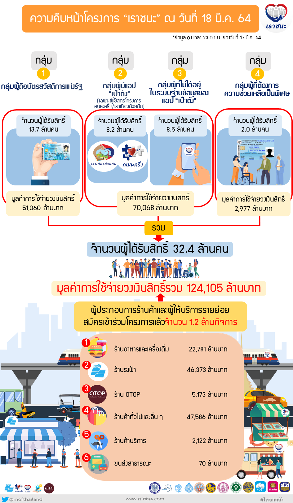 นอกจากนี้ โฆษกกระทรวงการคลัง ได้แถลงเพิ่มเติมถึงความคืบหน้าของโครงการฯ ณ วันที่ 18 มีนาคม 2564 ดังนี้ 1) ประชาชนกลุ่มผู้ถือบัตรสวัสดิการแห่งรัฐ จำนวน 13.7 ล้านคน ได้มีการใช้จ่ายตั้งแต่วันที่ 5 กุมภาพันธ์ 2564 เป็นต้นมา จำนวน 51,060 ล้านบาท 2) ประชาชนกลุ่มที่อยู่ในระบบฐานข้อมูลของแอปพลิเคชัน “เป๋าตัง” ในโครงการเราเที่ยวด้วยกันและคนละครึ่ง และกลุ่มประชาชนทั่วไปที่ลงทะเบียนทางเว็บไซต์ www.เราชนะ.com ที่ผ่านการคัดกรองคุณสมบัติเบื้องต้นและยืนยันการใช้สิทธิร่วมโครงการฯ แล้ว จำนวน 16.7 ล้านคน และมีการใช้จ่ายวงเงินสิทธิสะสมตั้งแต่วันที่ 18 กุมภาพันธ์ 2564 เป็นต้นมา จำนวน 70,068 ล้านบาท และ 3) ประชาชนกลุ่มผู้ที่ต้องการความช่วยเหลือเป็นพิเศษที่ผ่านการคัดกรองคุณสมบัติแล้ว จำนวน 2.0 ล้านคน มียอดใช้จ่ายวงเงินสิทธิสะสมตั้งแต่วันที่ 5 มีนาคม 2564 เป็นต้นมา จำนวน 2,977 ล้านบาท ทำให้มีผู้ได้รับสิทธิในโครงการฯ แล้ว รวมทั้งสิ้นจำนวน 32.4 ล้านคน คิดเป็นมูลค่าการใช้จ่ายหมุนเวียนในระบบเศรษฐกิจไทยแล้วกว่า 124,105 ล้านบาท ซึ่งเป็นการใช้จ่ายผ่านผู้ประกอบการร้านธงฟ้าราคาประหยัดพัฒนาเศรษฐกิจท้องถิ่นที่มีแอปพลิเคชัน “ถุงเงิน” ร้านค้าคนละครึ่งที่ตกลงยินยอมเข้าร่วมโครงการฯ รวมถึงผู้ประกอบการร้านค้าและผู้ให้บริการที่ลงทะเบียนเข้าร่วมโครงการฯ จำนวนทั้งสิ้นมากกว่า 1.2 ล้านกิจการ. – สำนักข่าวไทย