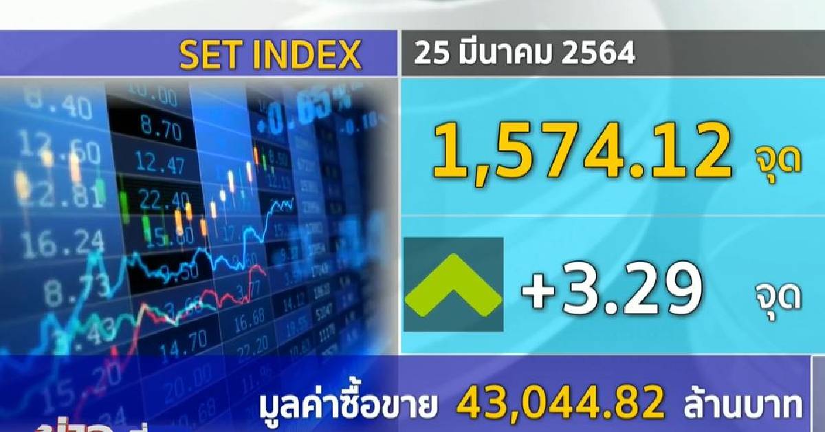 กทม. 25 มี.ค.-ตลาดหุ้นไทยภาคเช้า เปิดการซื้อขายวันนี้ เพิ่มขึ้น 5.30 จุด ดัชนีช่วงเที่ยงอยู่ที่ 1,574.12 จุด บวก 3.29 จุด มูลค่าซื้อขาย 43,044.82 ล้านบาท