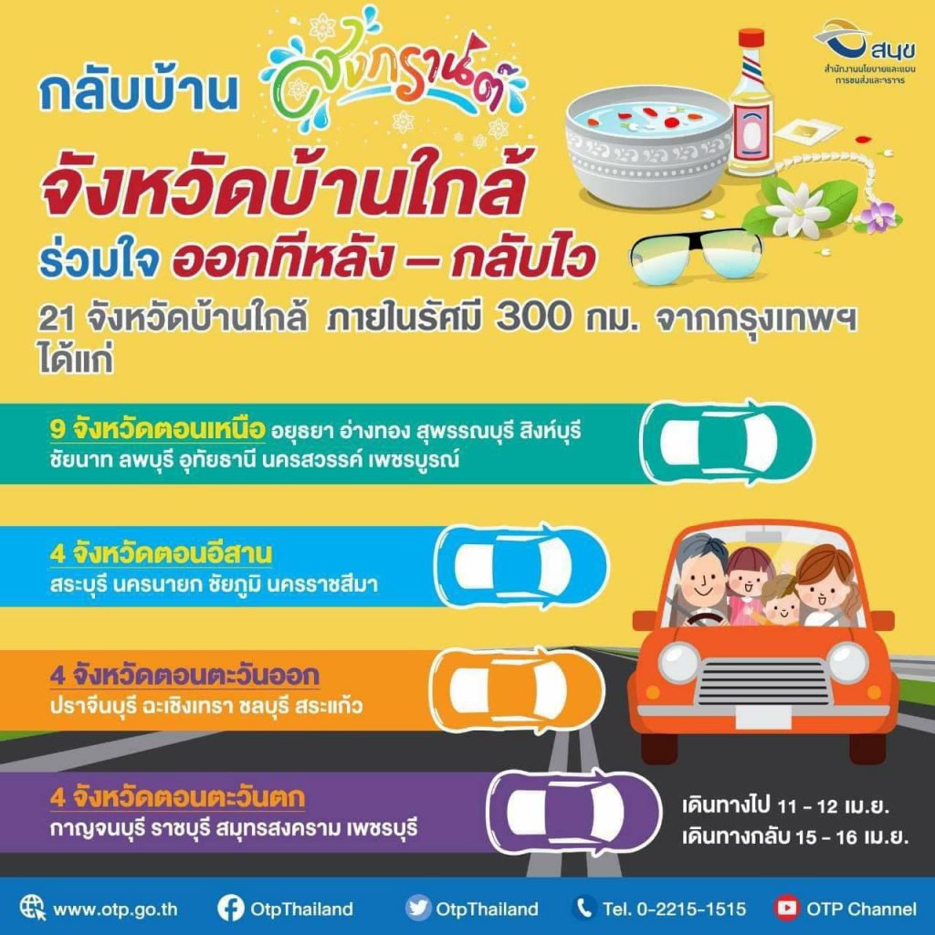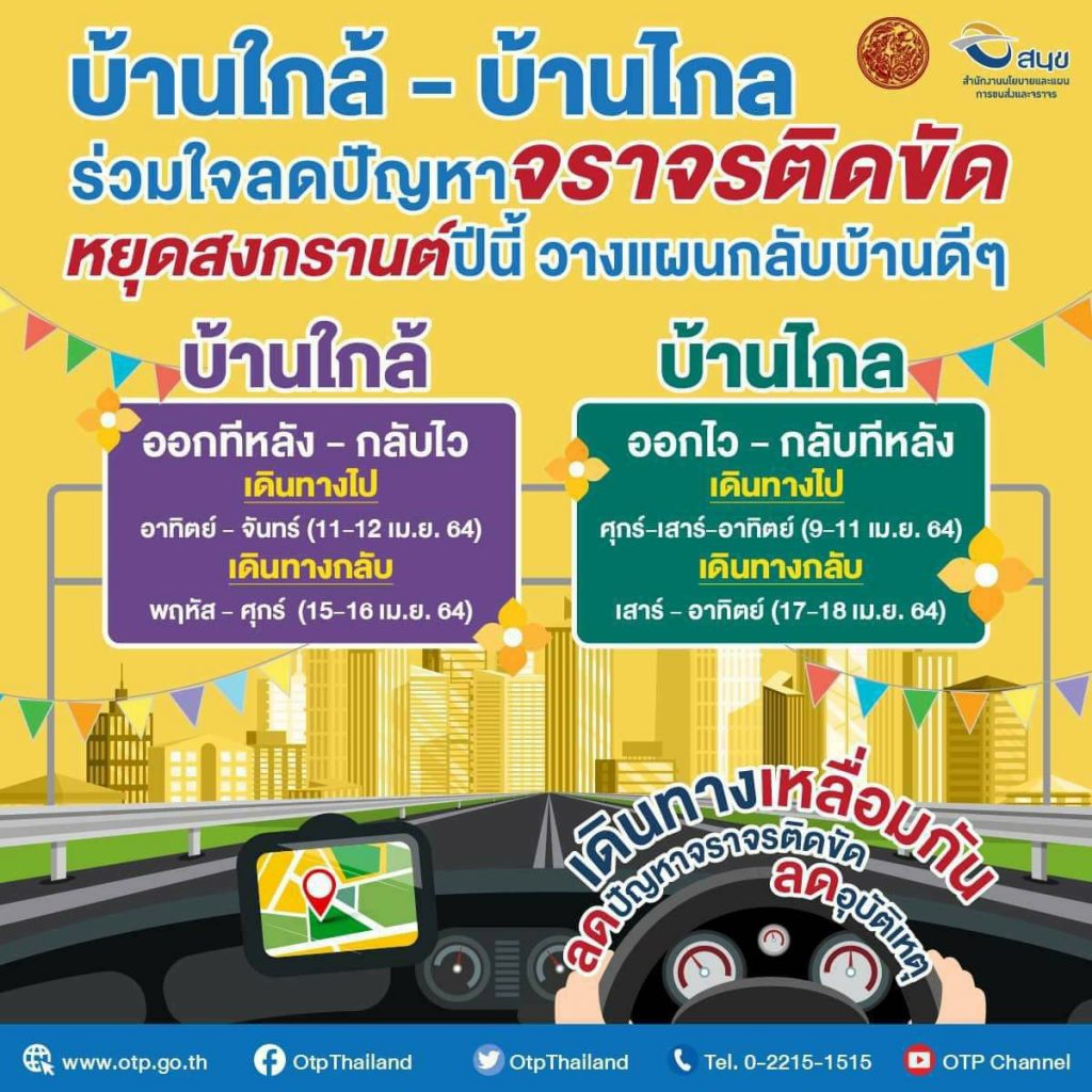 สนข. จึงขอความร่วมมือพี่น้องประชาชนวางแผนการเดินทางล่วงหน้าภายใต้มาตรการ “บ้านใกล้เดินทางออกทีหลัง และเดินทางกลับก่อน” เพื่อกระจายการเดินทางและเหลื่อมเวลาการเดินทางในเส้นทางเข้า-ออกกรุงเทพมหานคร โดยขอความร่วมมือพี่น้องประชาชนที่จะเดินทางกลับภูมิลำเนา หรือท่องเที่ยวภายในรัศมี 300 กิโลเมตรจากกรุงเทพมหานคร เดินทางออกช่วงระหว่างวันอาทิตย์ที่ 11 หรือวันจันทร์ที่ 12 เมษายน 2564 และเดินทางกลับ ช่วงระหว่างวันพฤหัสบดีที่ 15 หรือวันศุกร์ที่ 16 เมษายน 2564 โดยสามารถแบ่งเป็นกลุ่มจังหวัดบ้านใกล้ที่จะขอความร่วมมือจำนวน 21 จังหวัด ได้แก่