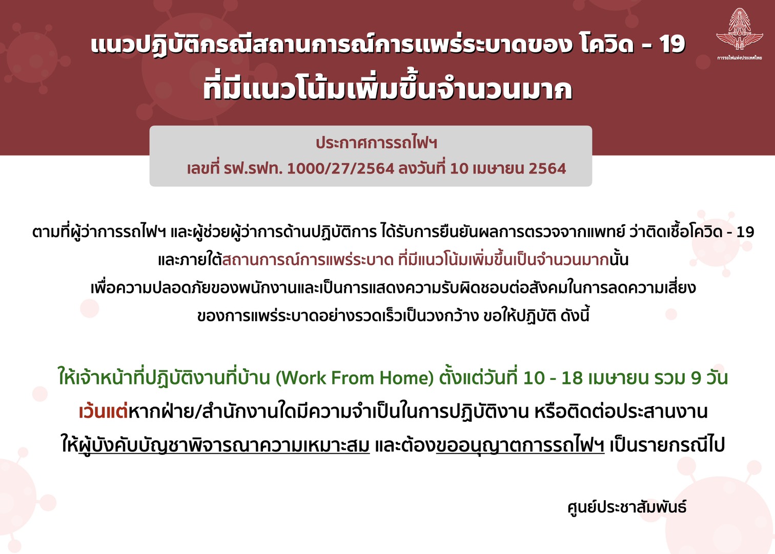 กรุงเทพฯ 11 เม.ย. – ผู้บริหารการรถไฟฯ ติดโควิด-19 อีกราย โดยการรถไฟฯ ได้ออกประกาศให้พนักงานรักษามาตรการเฝ้าระวัง ลดความเสี่ยง และ Work from Home แล้ว