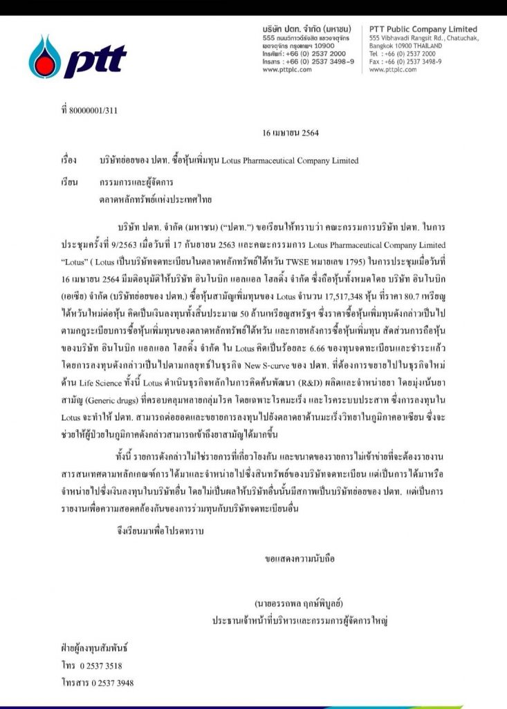 นายอรรถพล ฤกษ์พิบูลย์ ประธานเจ้าหน้าที่บริหารและกรรมการผู้จัดการใหญ่ บริษัท ปตท. จำกัด (มหาชน) แจ้งต่อตลาดหลักทรัพย์ วานนี้(16เม.ย.) ว่า คณะกรรมการบริษัทฯ มีมติอนุมัติให้ บริษัท อินโนบิก แอลแอล โฮลดิ้ง จํากัด ซึ่งถือหุ้นโดยบริษัท อินโนบิก (เอเชีย) จำกัด ที่เป็นบริษัทย่อยของ ปตท. ซื้อหุ้นสามัญเพิ่มทุนของ Lotus Pharmaceutical Company Limited (บริษัทจดทะเบียนในตลาดหลักทรัพย์ไต้หวัน) จํานวน 17,517,348 หุ้น ที่ราคา 80.7 เหรียญไต้หวันต่อหุ้น คิดเป็นเงินลงทุนทั้งสิ้นประมาณ 50 ล้านเหรียญสหรัฐฯ (ประมาณ 1,561 ล้านบาท) คิดเป็นสัดส่วน 6.66% ของจำนวนหุ้นทั้งหมด