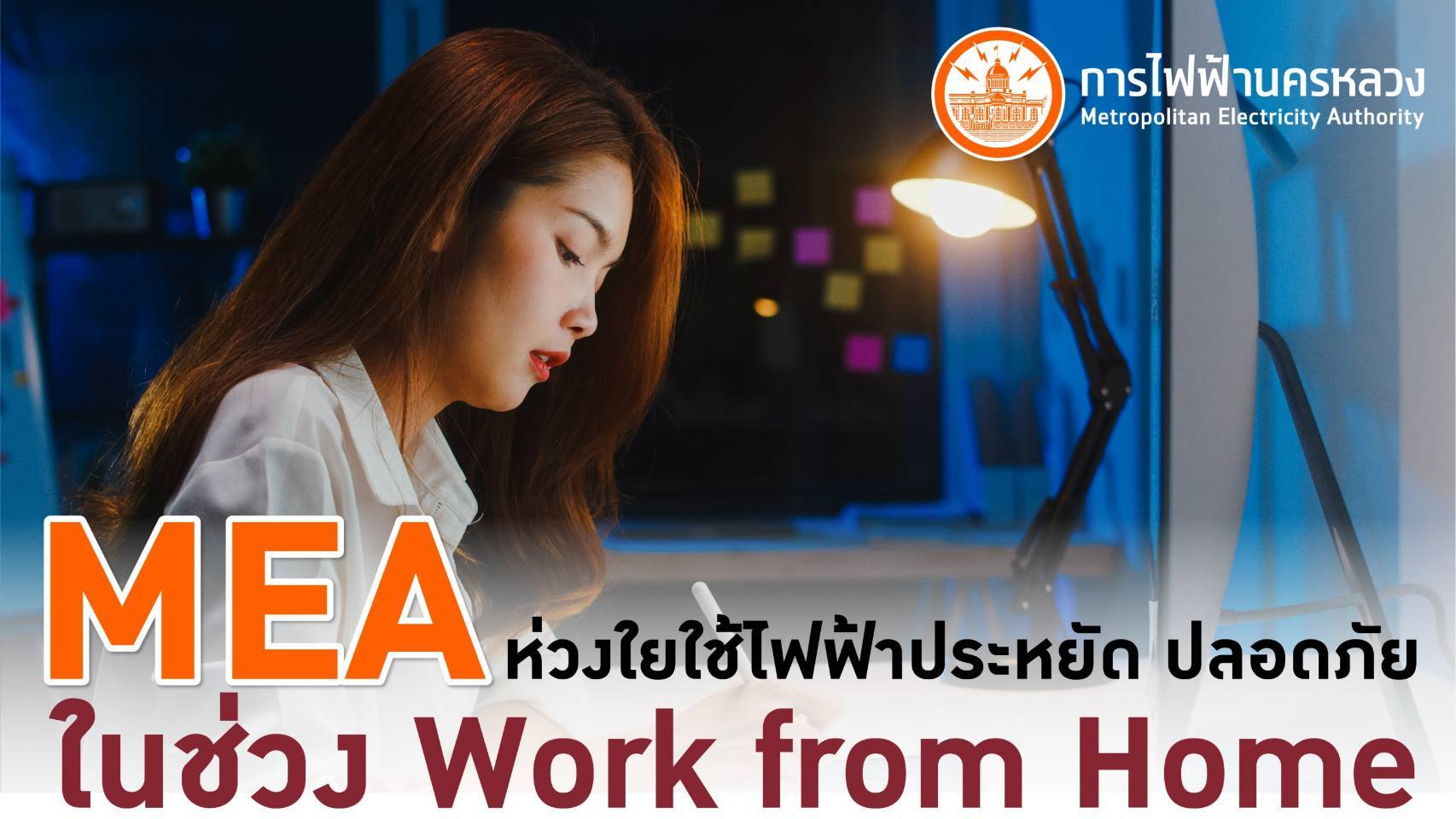 นอกจากนี้ MEA มีคำแนะนำการใช้ไฟฟ้าในบ้านในช่วง Work from Home ให้ประหยัดไฟและปลอดภัย โดย ถอดปลั๊กทุกครั้งหลังใช้งาน เลือกใช้หลอดไฟแบบ LED ปิดสวิตช์ไฟดวงที่ไม่ใช้ เปิดเครื่องปรับอากาศในอุณหภูมิที่พอเหมาะ 26°C แต่หากต้องการความรู้สึกเย็นสบายเท่ากับ 24°C ให้เปิดพัดลมช่วย โดยไม่ต้องลดอุณหภูมิของเครื่องปรับอากาศ และควรล้างเครื่องปรับอากาศอย่างน้อยปีละ 2 ครั้ง การใช้เตารีดให้ประหยัดควรรีดผ้าครั้งละมาก ๆ ไม่ควรรีดบ่อย ๆ โทรทัศน์เมื่อเลิกใช้ควรปิด และถอดปลั๊กทุกครั้งไม่ควรปิดด้วยรีโมทเพียงอย่างเดียว จัดระเบียบตู้เย็นให้เหมาะสมไม่เปิดตู้เย็นบ่อย ๆ ไม่เปิดทิ้งไว้นาน ๆ เมื่อใช้เครื่องดูดฝุ่นควรทิ้งฝุ่นในถุงเครื่องดูดฝุ่นทุกครั้ง เพื่อให้มีแรงดูดดีขึ้น และหมั่นดูแลบำรุงรักษาเครื่องใช้ไฟฟ้าให้พร้อมใช้งานและปลอดภัยอยู่เสมอ รวมถึงหมั่นตรวจสอบสายไฟฟ้า ให้อยู่ในสภาพดีหากพบว่าชำรุดควรเปลี่ยนใหม่ให้อยู่ในสภาพที่สมบูรณ์ รวมทั้งติดตั้งสายดินพร้อมเครื่องตัดไฟรั่วเพื่อป้องกันอันตรายจากกระแสไฟฟ้า เพื่อเป็นการป้องกันอันตรายจากกระแสไฟฟ้าลัดวงจรที่ก่อให้เกิดอัคคีภัย เลือกใช้อุปกรณ์ไฟฟ้าที่ประหยัดพลังงาน บำรุงรักษาเครื่องใช้ไฟฟ้าให้พร้อมใช้งานเพื่อความปลอดภัยอยู่เสมอ อีกทั้งเป็นการช่วยประหยัดพลังงานลดค่าไฟฟ้าลงได้ รวมถึงปรับเปลี่ยนพฤติกรรมการใช้ไฟฟ้าซึ่งมีส่วนสำคัญที่ทำให้ประหยัดค่าไฟฟ้าได้อีกด้วย