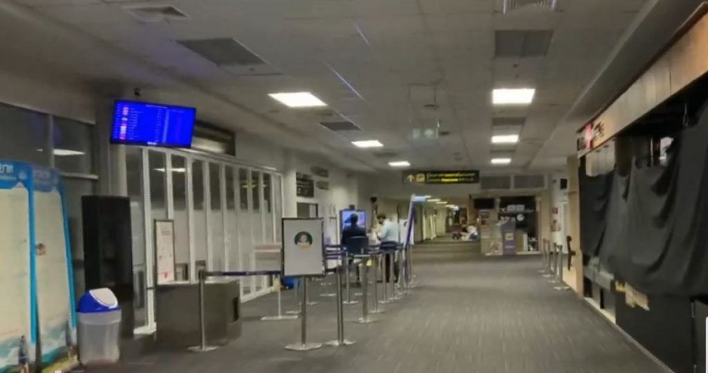 ที่ท่าอากาศยานหาดใหญ่ จ.สงขลา มีเพียงพนักงานที่ปฏิบัติหน้าที่รักษาความสงบเรียบร้อยอยู่ภายในท่าอากาศยานเท่านั้น ร้านค้า และเคาน์เตอร์บริการต่างๆ ปิดตามสถานการณ์ ขณะที่สถานการณ์การติดเชื้อโควิด-19 ในจังหวัดสงขลา มีผู้ติดเชื้อสะสมแล้วกว่า 9,400 คน เสียชีวิตสะสม 44 คน และยังพบคลัสเตอร์ใหม่ในตลาดทรัพย์สิน อ.เมืองสงขลา ซึ่งเป็นตลาดใหญ่ในตัวเมือง ทำให้เทศบาลนครสงขลาประกาศปิดตลาดทรัพย์สินเป็นเวลา 7 วัน ตั้งแต่วันที่ 22 – 28 กรกฎาคมนี้