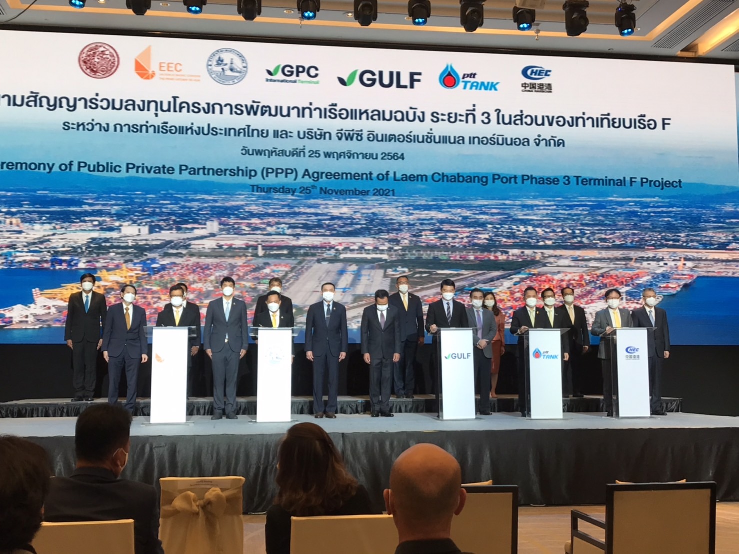 กรุงเทพฯ 25 พ.ย. – การท่าเรือแห่งประเทศไทย และ บริษัท จีพีซี อินเตอร์เนชั่นแนล เทอร์มินอล จำกัด ร่วมลงนามโครงการพัฒนาท่าเรือแหลมฉบังระยะ 3 ในส่วนท่าเทียบเรือ F เพิ่มขีดสามารถรับตู้สินค้าได้สูงถึง 18 ล้านตู้ต่อปี