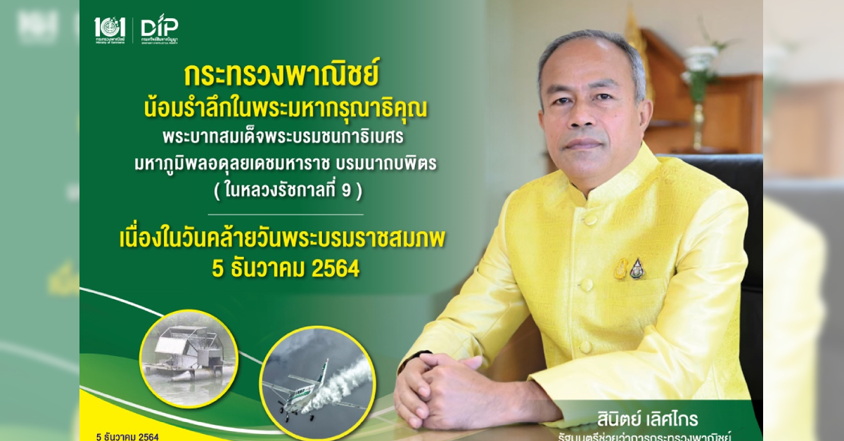 เนื่องในวันคล้ายวันพระบรมราชสมภพ 5 ธันวาคม 2564 กระทรวงพาณิชย์ ร่วมน้อมรำลึกในพระมหากรุณาธิคุณ พระบาทสมเด็จพระบรมชนกาธิเบศร มหาภูมิพลอดุลยเดชมหาราช บรมนาถบพิตร ด้วยการเผยแพร่ภาพยนตร์การ์ตูนแอนิเมชัน “ฟ้าทอฝัน The Inspiring King” ชุดที่ 1-3 โดยรับชมผ่านช่องทางออนไลน์ยูทูบ (YouTube) “กรมทรัพย์สินทางปัญญา” https://bit.ly/3rzznGx ที่เล่าเรื่องราวของการน้อมนำแนวคิดในพระปรีชาสามารถ ด้วยพระราชปณิธานอันแรงกล้าและพระอัจฉริยภาพอันล้ำเลิศด้านทรัพย์สินทางปัญญาของพระองค์ท่าน อันประโยชน์ให้เกิดการพัฒนาคุณภาพชีวิตของพสกนิกรให้สามารถพึ่งพาตนเองและดำรงชีวิตได้อย่างมีความสุข สร้างขวัญกำลังใจ และสร้างแรงบันดาลใจให้แก่พสกนิกรอย่างยั่งยืนสืบไป. – สำนักข่าวไทย