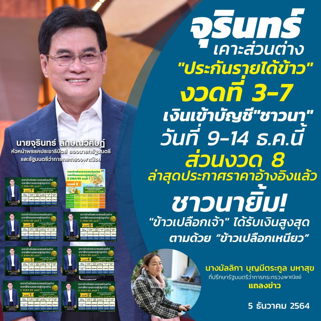 นายจุรินทร์ ลักษณวิศิษฏ์ รองนายกรัฐมนตรีและรัฐมนตรีว่าการกระทรวงพาณิชย์กล่าวว่า การประกันรายได้ข้าวผลการผลิตปีที่3 ฤดูกาลปลูก 2564 / 2565 การเก็บเกี่ยวเริ่มตั้งแต่ 15 ตุลาคมเป็นต้นมาและเคาะจ่ายส่วนต่างราคาข้าวโครงการประกันรายได้เกษตรกรงวด1-2และ3บางส่วนไปแล้วนั้น โดยล่าสุดได้สั่งการให้ทุกฝ่ายที่เกี่ยวข้องติดตามนโยบายอย่างใกล้ชิด ซึ่งได้รับรายงานจากธนาคารเพื่อการเกษตรและสหกรณ์การเกษตร หรือ ธ.ก.ส.โดยเงินส่วนต่างที่ค้างอยู่งวดที่ 3-7 จะเริ่มทยอยเข้าบัญชีเกษตรกรที่ขึ้นทะเบียนไว้ตั้งแต่วันที่ 9-14 ธ.ค.2564 นี้ ส่วนงวดที่ 8 จะโอนในลำดับถัดไป